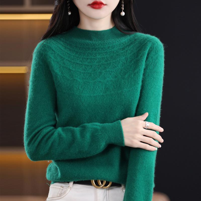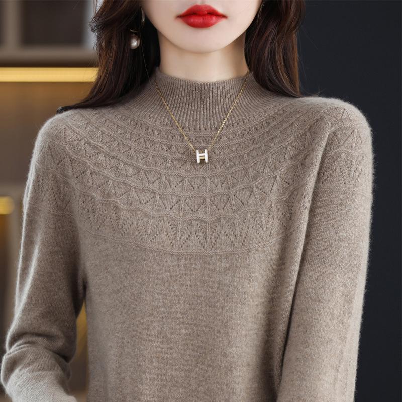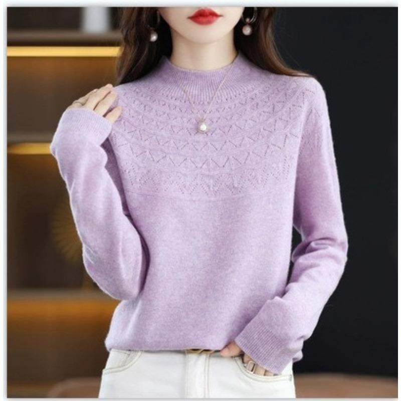 Осень Зима Половина Высокого Воротника Ажурный Повседневный Модный Свитер с Подкладкой Женский Однотонный Пуловер Вязаный Топ