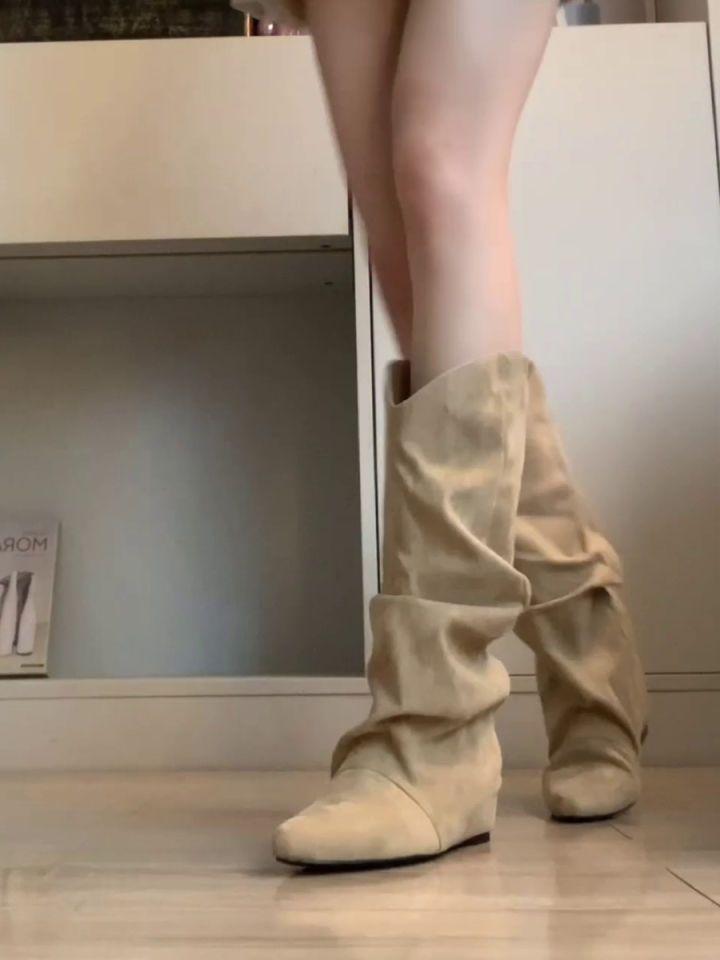 Мода 2025 года, высокие остроносые плиссированные ботфорты с присборенным голенищем, женские облегающие ретро-вестерн сапоги средней высоты