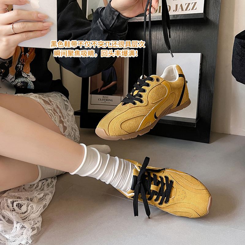 2025 осень новые туфли для моральной подготовки в студенческом стиле из коровьего вельвета, мягкие восковые повседневные одинарные туфли на шнуровке, маленькие желтые туфли, конфиденциальные волосы