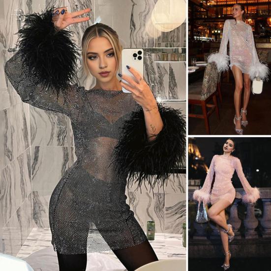 Подчеркните свой стиль с помощью этого потрясающего сексуального платья.. Это вечернее платье идеально подходит для различных случаев и излучает сексуальность и модность.. Изготовленное из тонкого блестящего материала, оно имеет круглый вырез, длинные рукава и манжеты с меховой отделкой, что придает ему нотку элегантности..