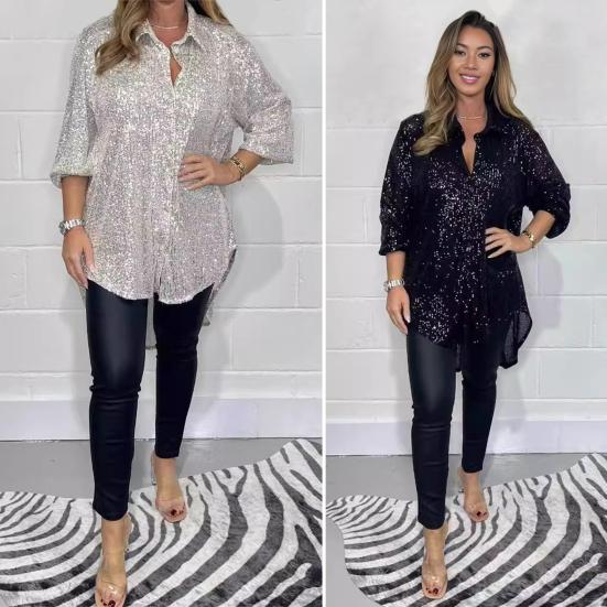Поднимите свой стиль с этой шикарной женской рубашкой. Эта рубашка, изготовленная из дышащего и приятного для кожи полиэстера, обеспечивает комфорт при ношении.. Модный дизайн с пайетками подчеркнет вашу идеальную фигуру, а крой средней длины добавит элегантности вашему образу..