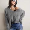 Осень Зима V-образный вырез Однотонный Базовый Вязаный Топ Женский Повседневный Модный Пуловер Свитер из Искусственного Меха Минки