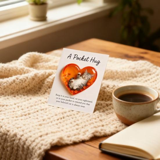 Душевный акриловый дизайн: Изготовленный из прозрачного акрила в форме сердца, этот карманный обнимашка украшен очаровательным кошачьим узором, излучающим тепло и любовь благодаря своим ярким цветам и сложной детализации.