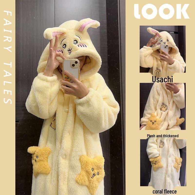 Женский комплект пижамы и халата из кораллового флиса Usagi - Милая мультяшная фланелевая домашняя одежда для осени и зимы.