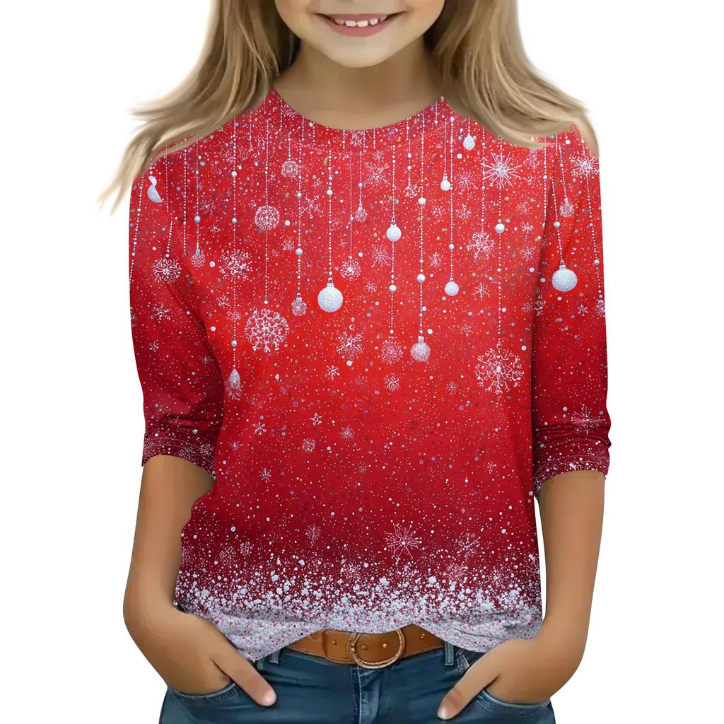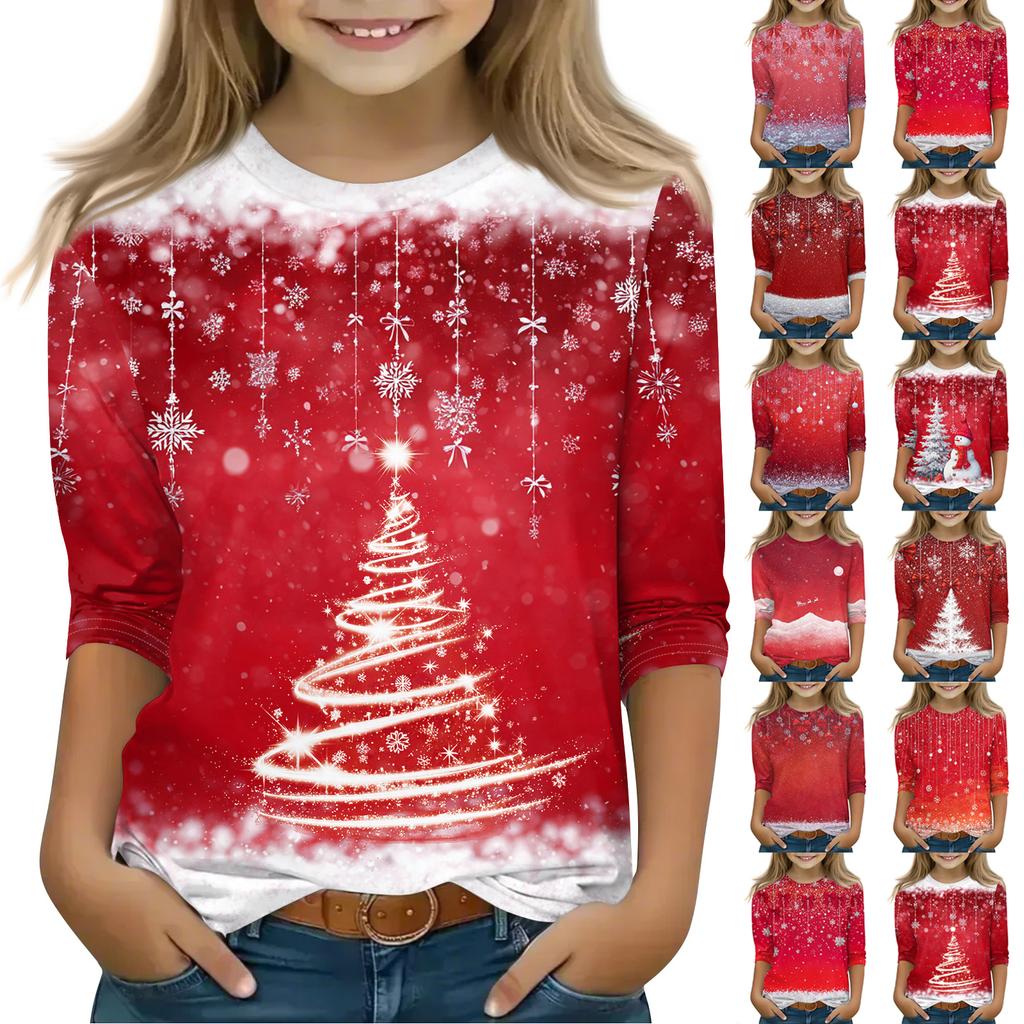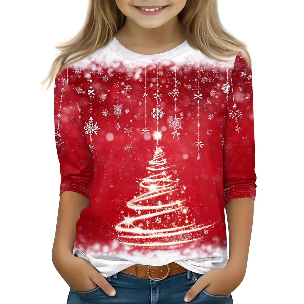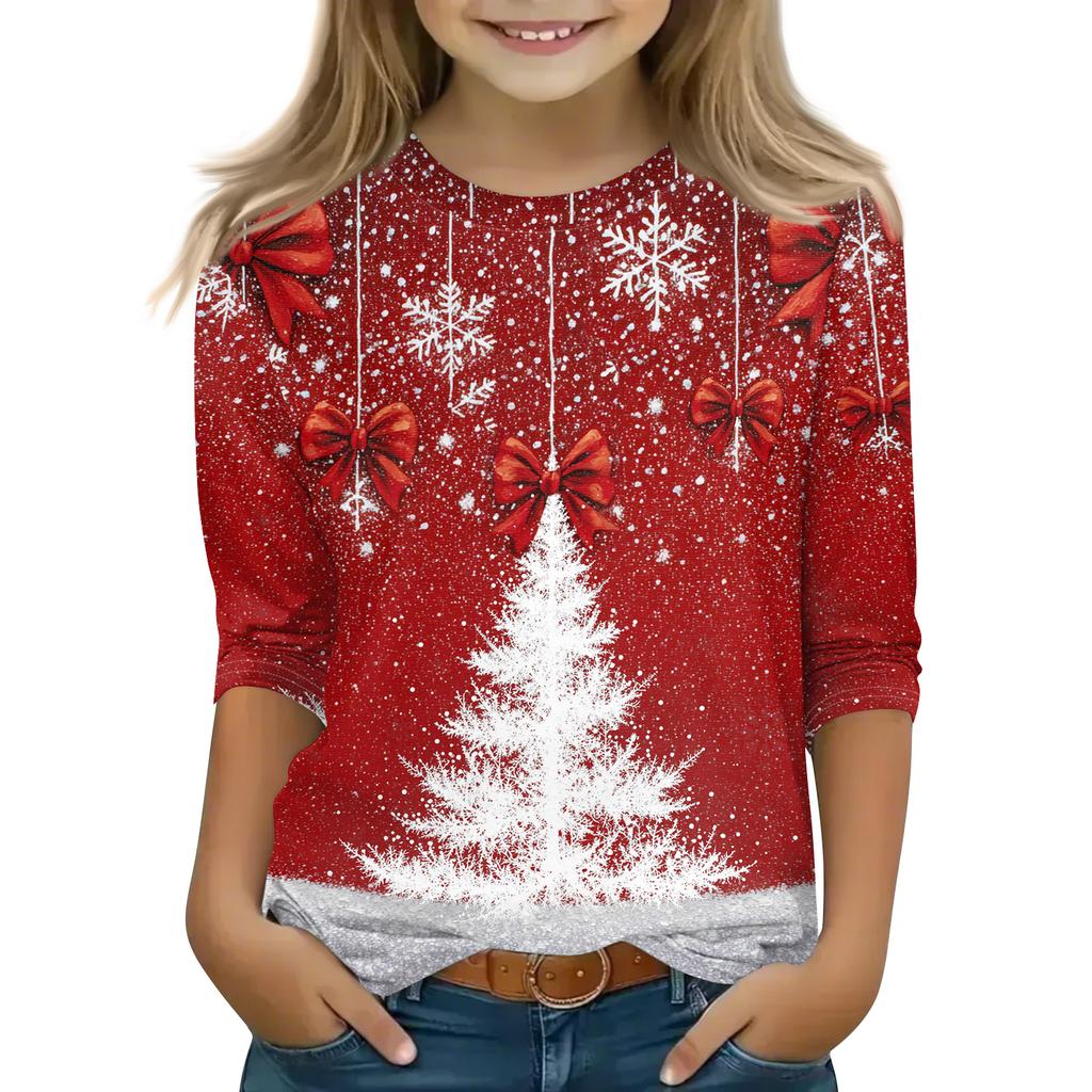 Рождественские топы с принтом для девочек-подростков 4-11 лет, футболки с круглым вырезом и рукавами 3/4, модные топы, нарядные футболки