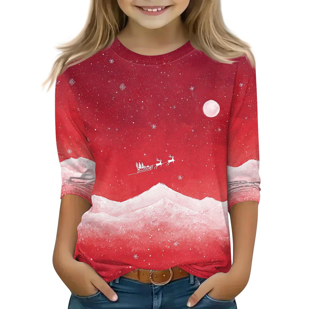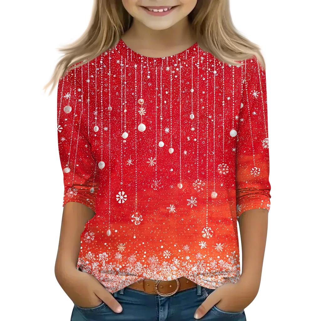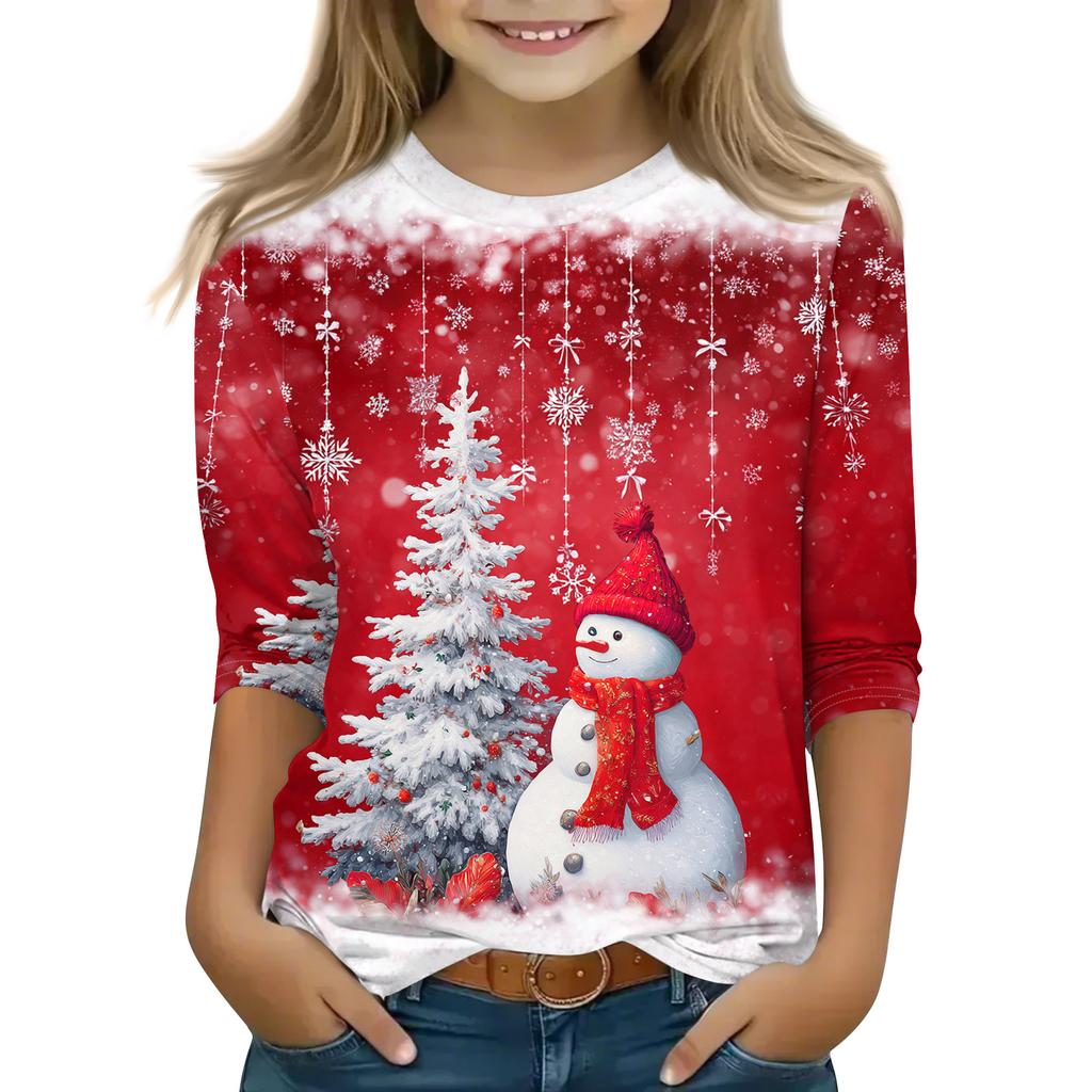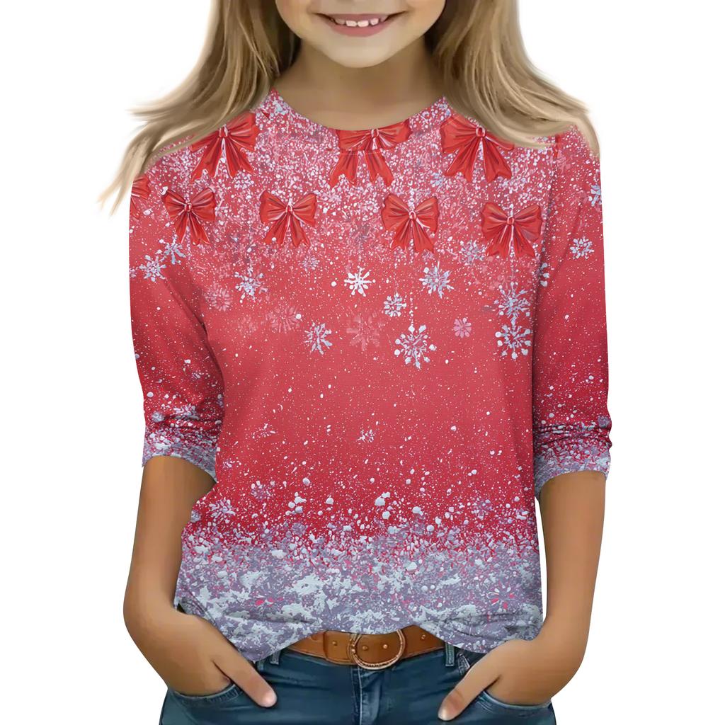 Рождественские топы с принтом для девочек-подростков 4-11 лет, футболки с круглым вырезом и рукавами 3/4, модные топы, нарядные футболки