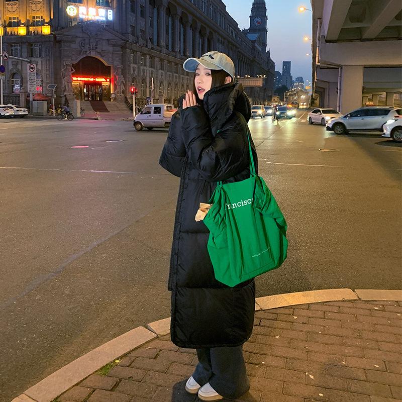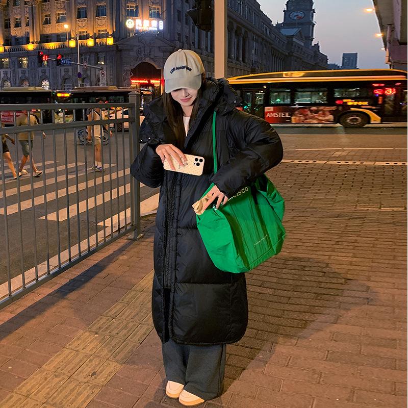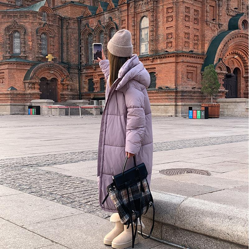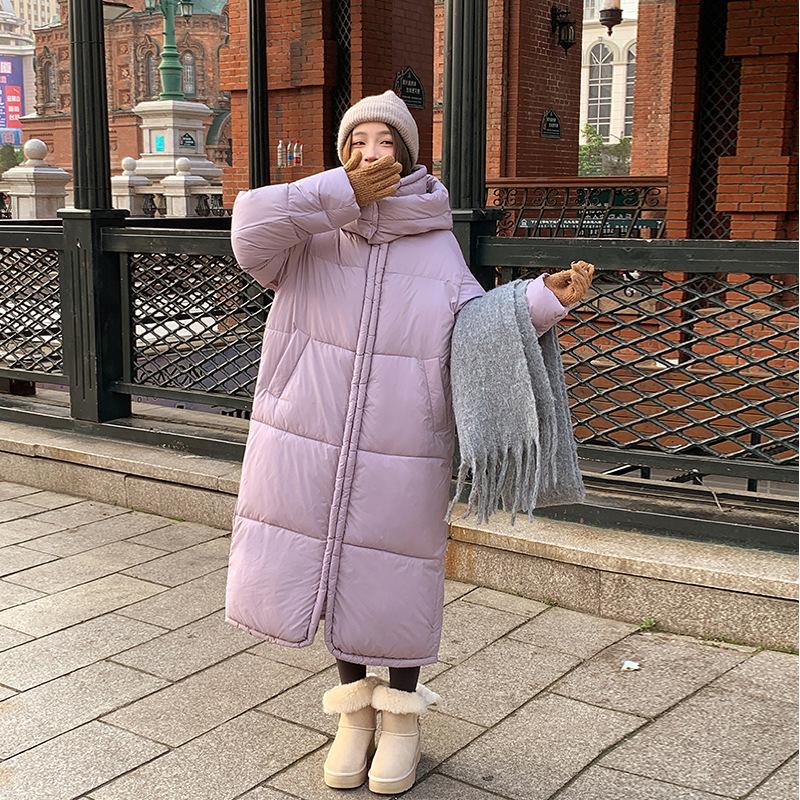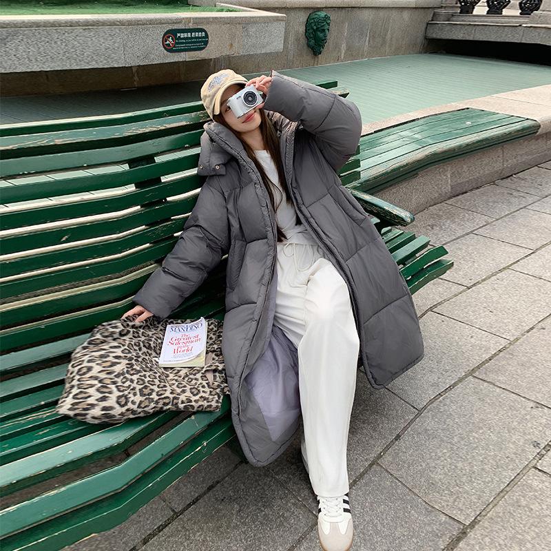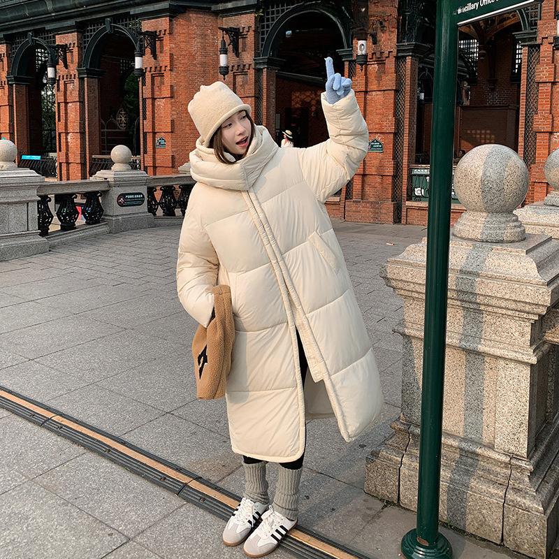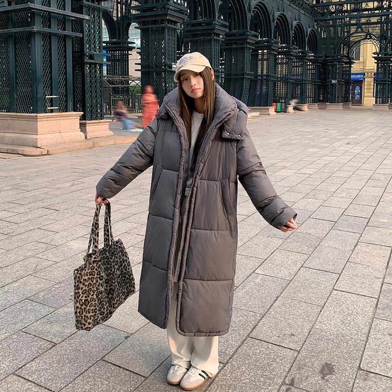 Утолщенная Длинная Хлопковая Одежда на Пуху Интернет-Знаменитости с Тем же Воротником-стойкой Капюшоном Теплое Свободное Пальто