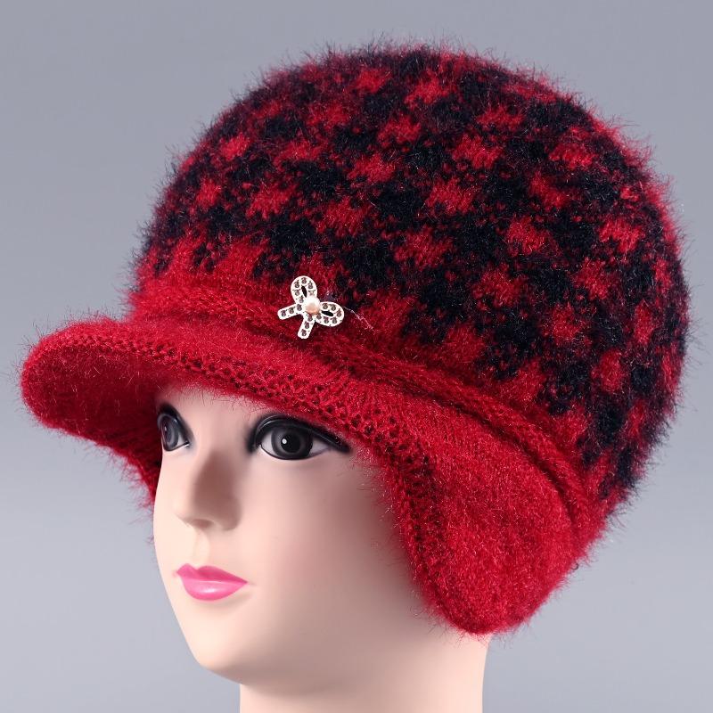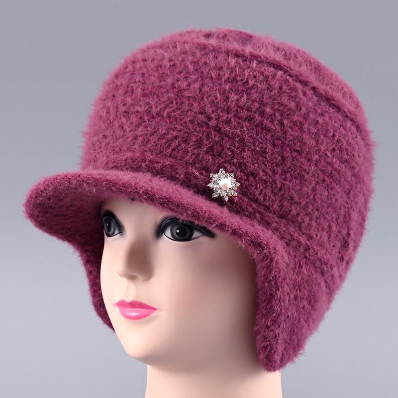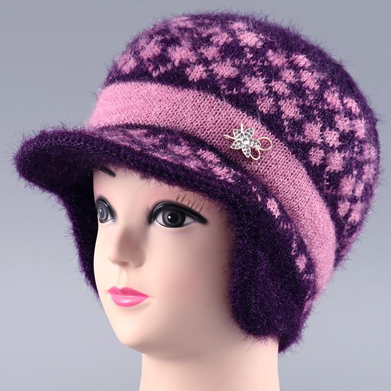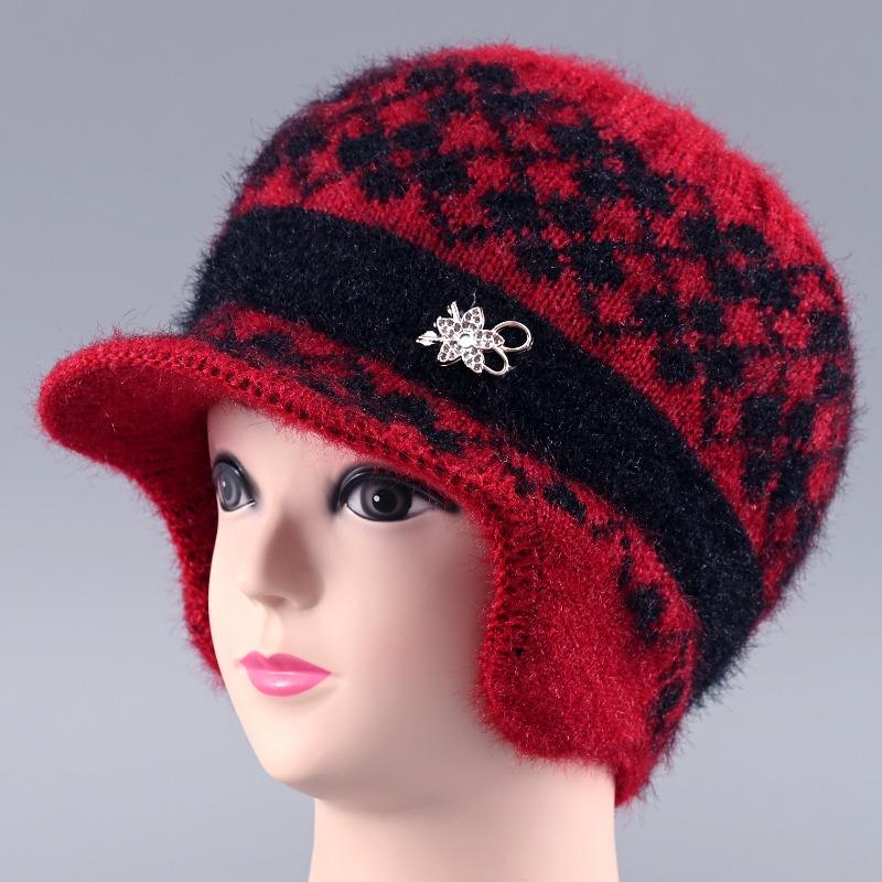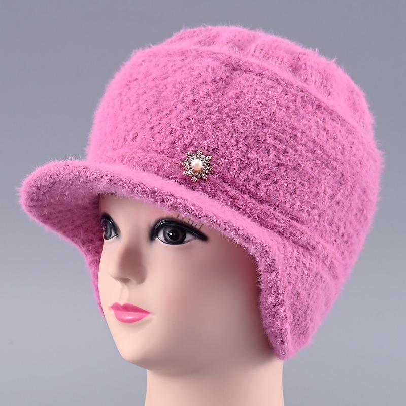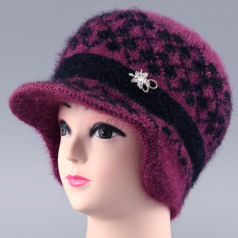 Шапка Женская Зимняя Кроличий Мех Теплая Шерстяная Шапка Пожилая Женщина Защита от Холода Защита Ушей Вязаная Шапка