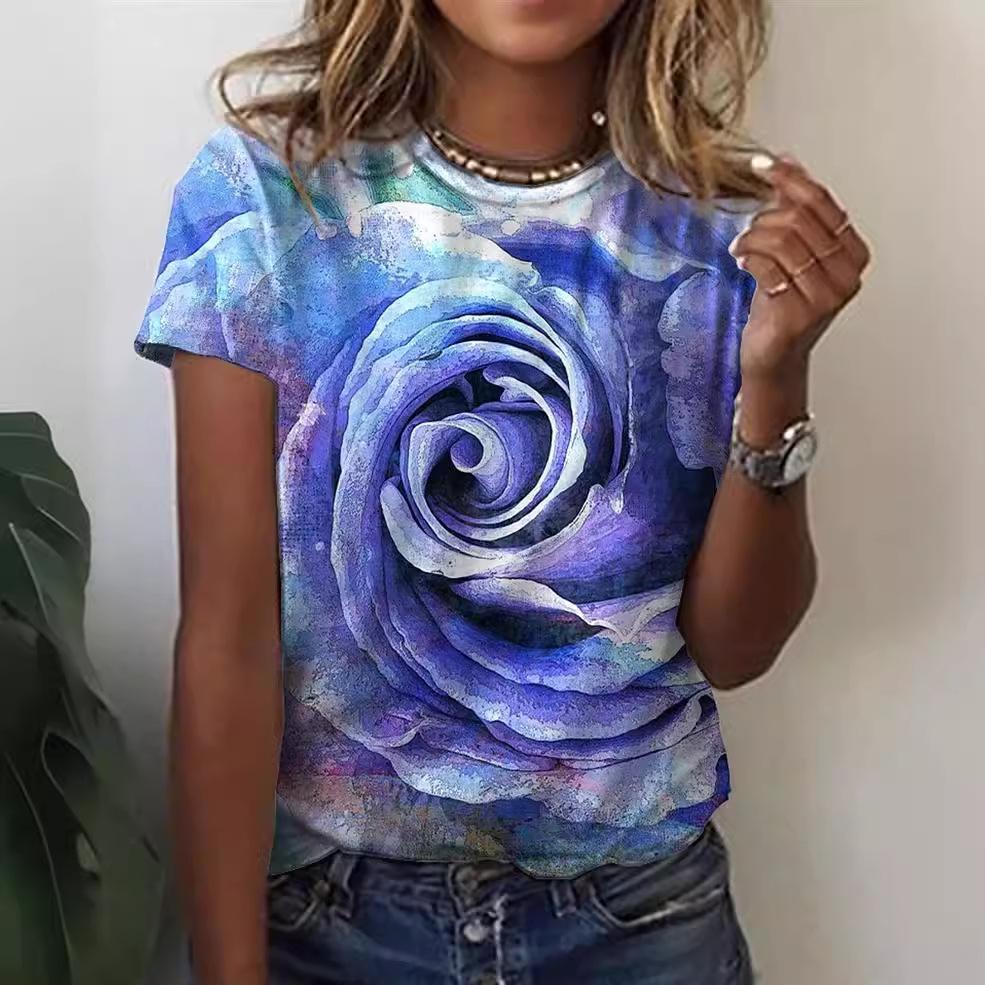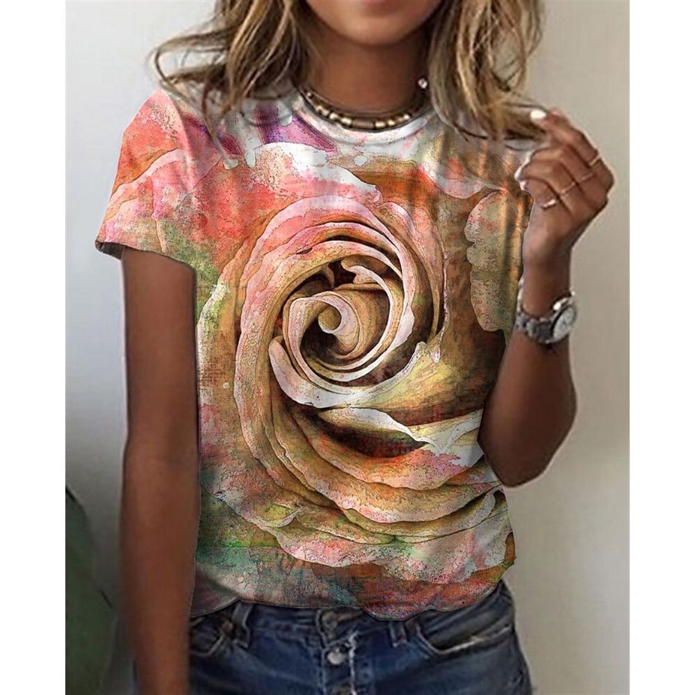 Топ с круглым вырезом и 3D-принтом цветов, модные повседневные женские футболки с коротким рукавом - Мягкая полиэстеровая ткань средней эластичности, летняя одежда свободного кроя