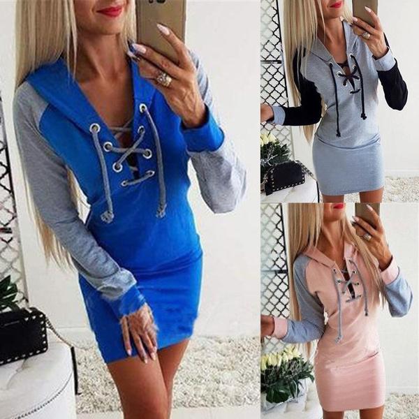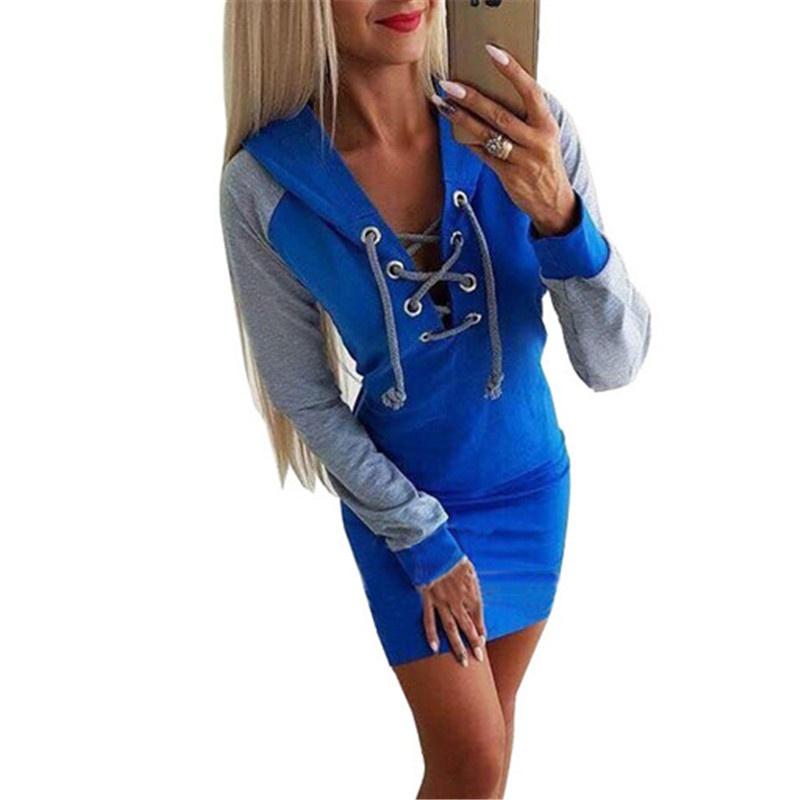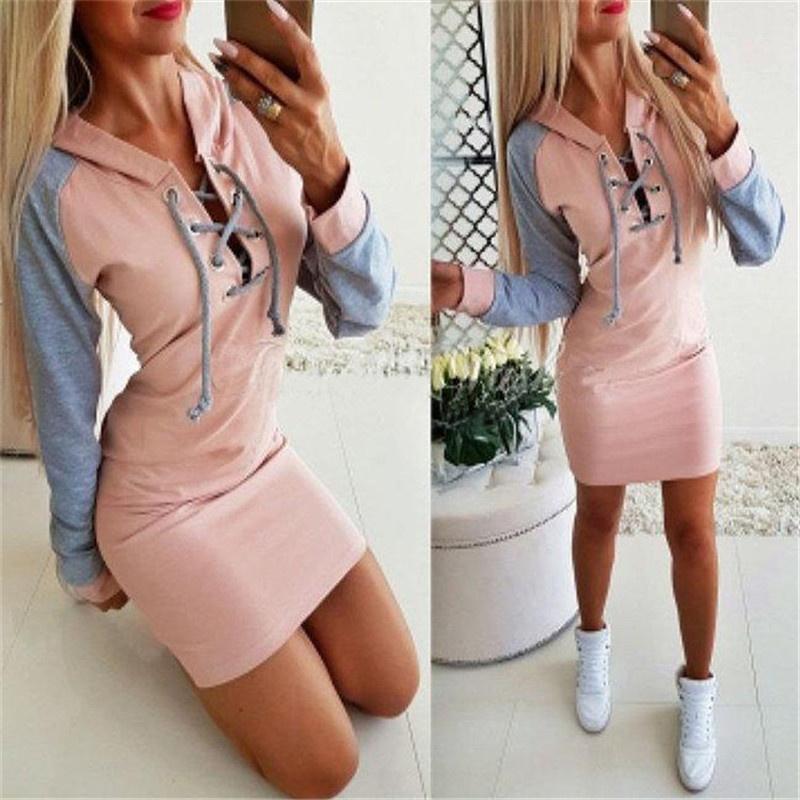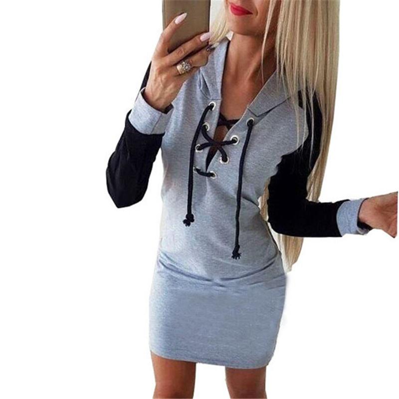 Платье на шнуровке с V-образным вырезом, женское облегающее платье с длинными рукавами, повседневное платье с капюшоном в стиле пэчворк