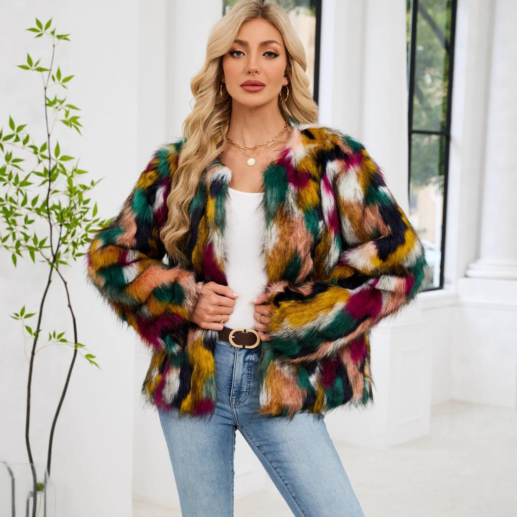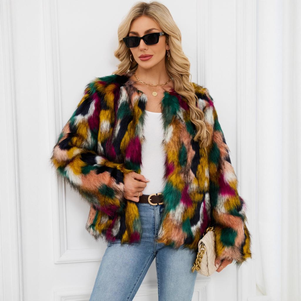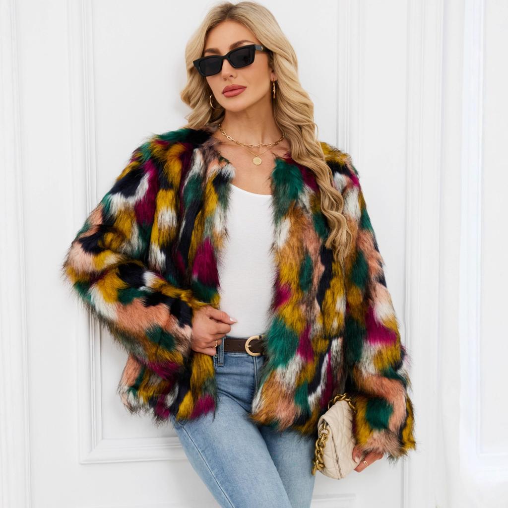 Новая красочная куртка из искусственного меха, короткая, с длинным рукавом, без воротника, повседневная женская зимняя шерстяная куртка