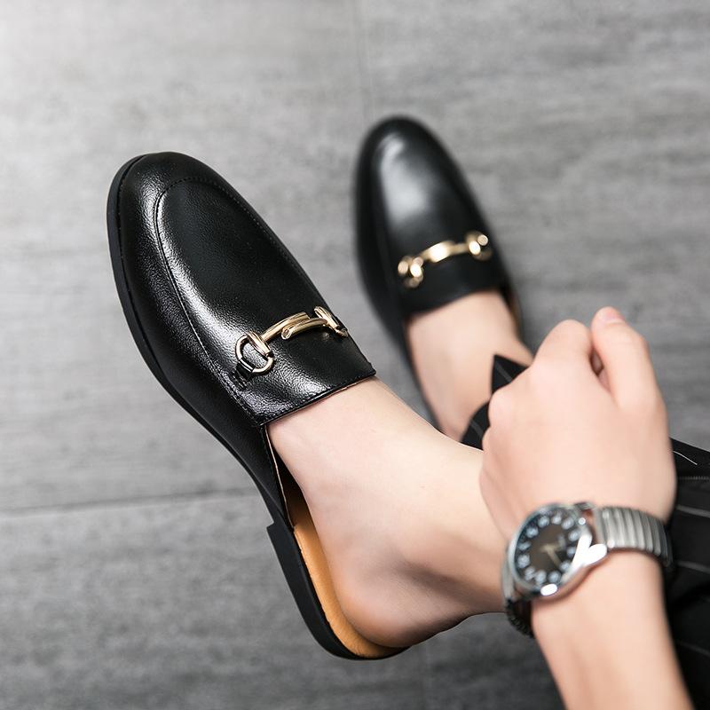 Мужская обувь лето новая закрывающая ногу полушлепанцы мужские сандалии британский стиль сумка голова без помощи прохладные тапочки маленькие кожаные туфли мужские