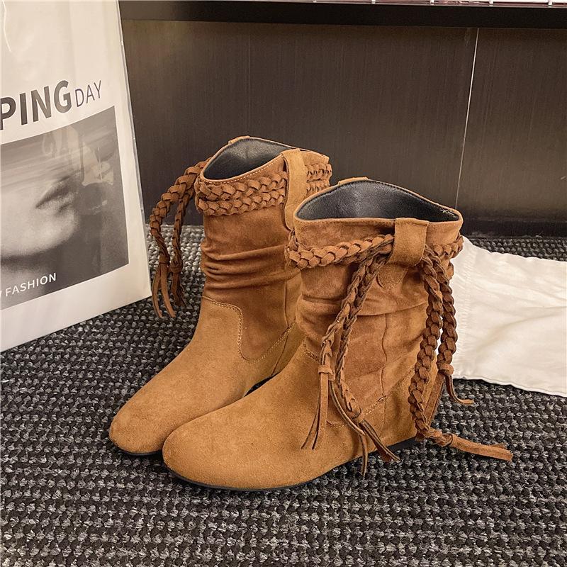 Ретро стиль квадратный носок замшевые с бахромой ремешок толстый каблук полусапожки женские осень 2025 новый рукав универсальные сапоги с бахромой