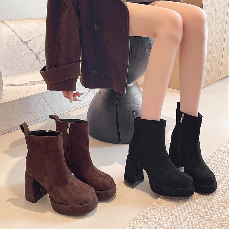 Замшевые короткие ботильоны на высоком каблуке в ретро-темпераментном стиле, осенне-зимние, корейская версия, французская мода, универсальные, на толстом каблуке, тонкие ботильоны, женские ботинки Мартин — купить товар онлайн с бесплатной доставкой по всему миру!
