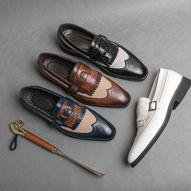 2024 Роскошные мужские деловые туфли из спилковой кожи, Модные свадебные оксфорды с пряжкой и острым носком, Черные, белые, кофейные броги, Нарядные туфли