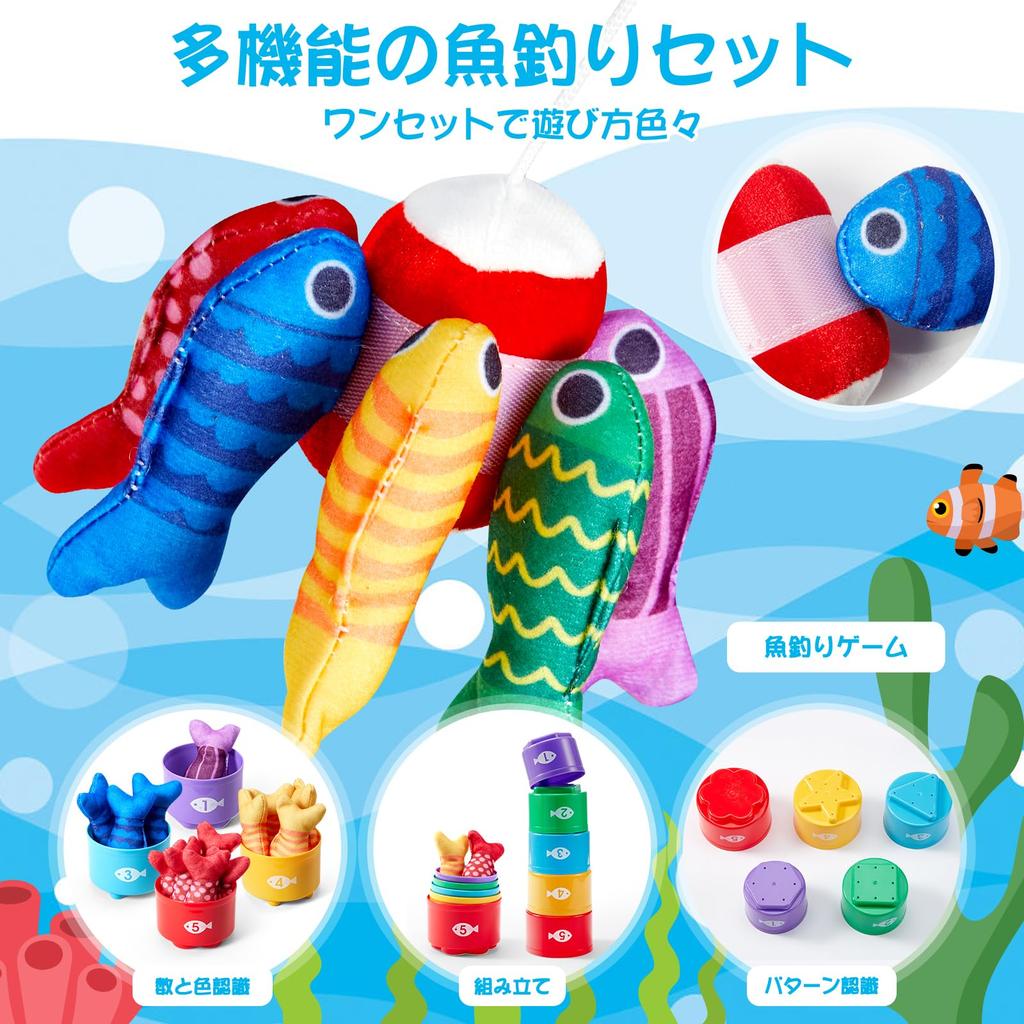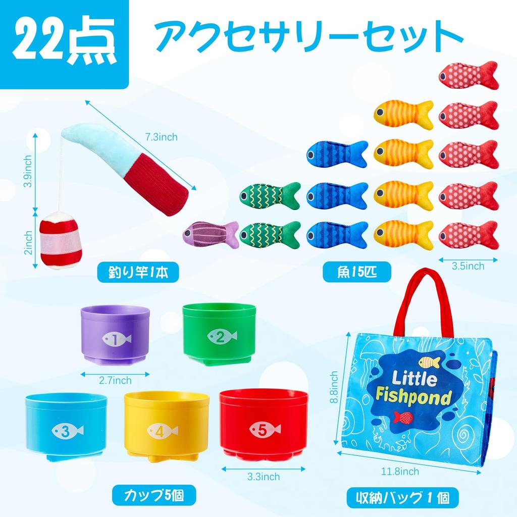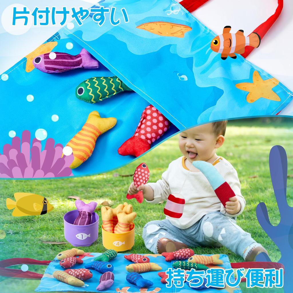 [Развивающая игрушка Монтессори] Этот набор развивающих игрушек Монтессори включает в себя тканевый набор для рыбалки из 22 предметов, в том числе удочку, 15 рыбок, 5 штабелируемых ведерок-рыбок и коврик с морским дном, который также служит сумкой для хранения, поощряя естественное любопытство малышей, эмпирическое обучение и активное исследование, способствуя развитию навыков.
