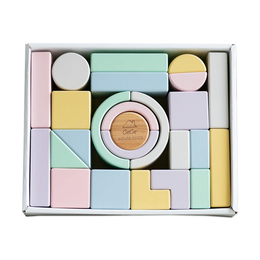 Деревянные строительные блоки Coco Blocks. Эти блоки молочного цвета издают звуки и отлично смотрятся в солнечной комнате.. Базовый размер основания 4,5 см делает их удобными для игры даже по мере взросления младенцев.. Они используют краску, безопасную для облизывания, поэтому даже маленькие дети могут играть с ними безопасно.. Это оригинальный продукт, который можно приобрести только в Edute, производителе развивающих игрушек с более чем 20-летним опытом.