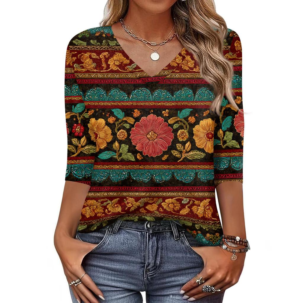 Женская футболка с принтом, рукав 3/4, повседневная мода на выходные, базовый топ с V-образным вырезом