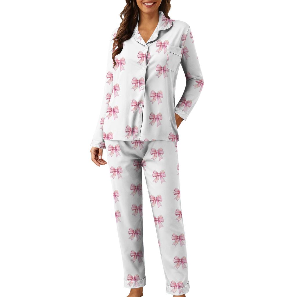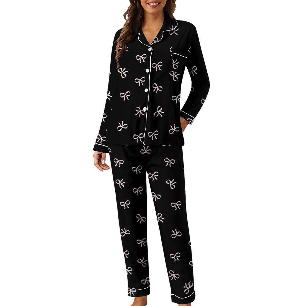 Женский повседневный модный комплект для дома свободного кроя с принтом бантов, брюки с длинными рукавами