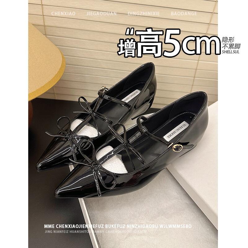 Версия из овчины, туфли Мэри Джейн со скрытой внутренней высотой, женские туфли с бантом и острым носком, кожаные, с мелким вырезом, универсальные туфли для通勤