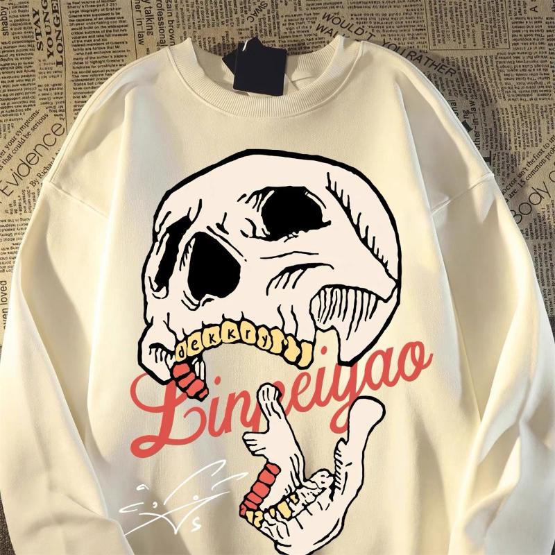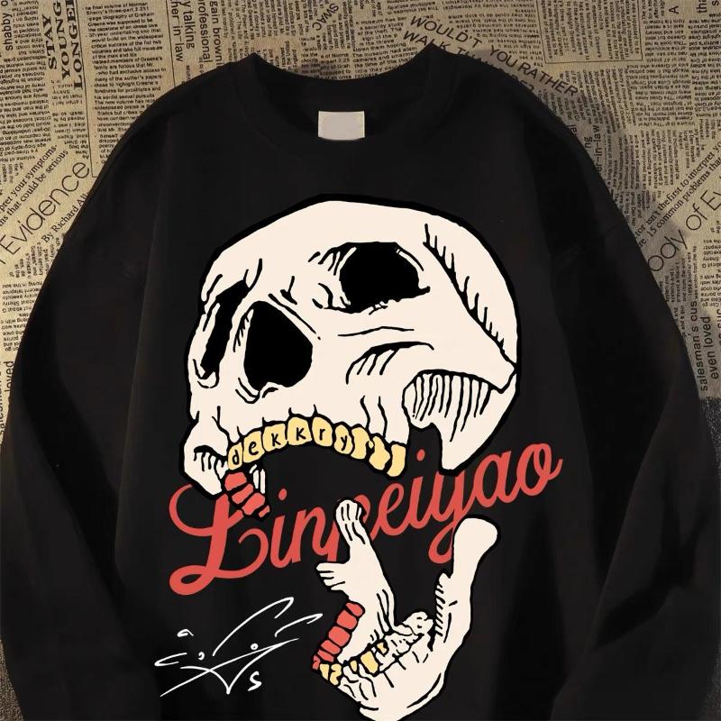 Американский Хип-хоп Красивая Тяжелая Футболка Мужская Осень Зима Уличная Принт Черепа Свободные Топы с Длинным Рукавом Модные