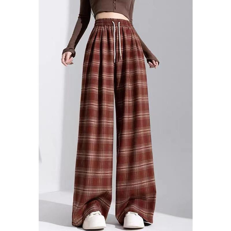 Красные ретро клетчатые брюки для женщин на осень с высокой посадкой, свободные повседневные брюки прямого кроя для клетчатой ткани, универсальные широкие брюки
