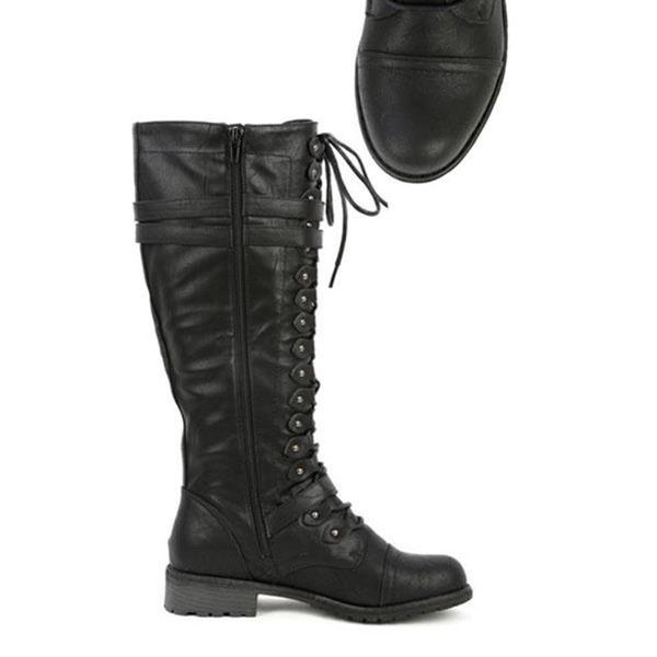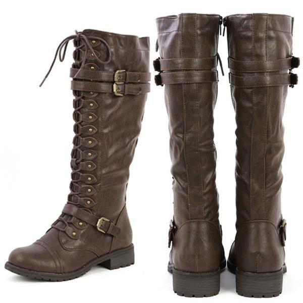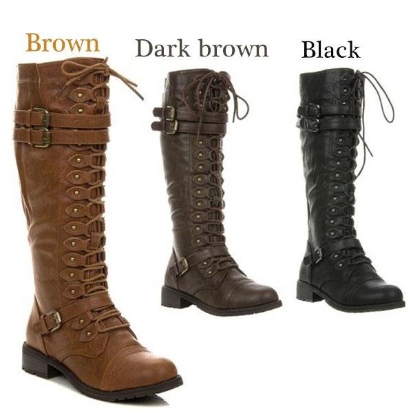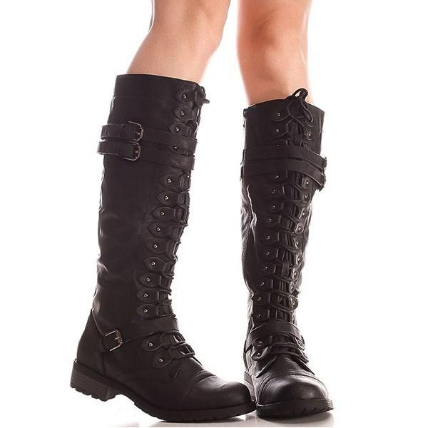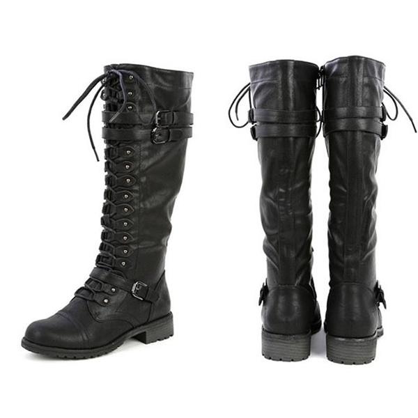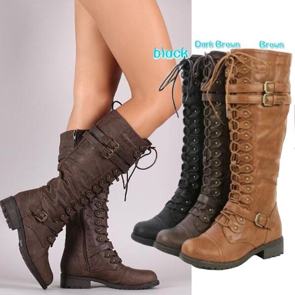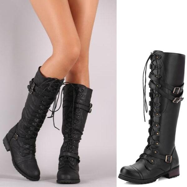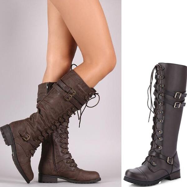 Зимние женские кожаные армейские ботинки до колена в винтажном стиле, ботинки для верховой езды на шнуровке с пряжкой в стиле ретро