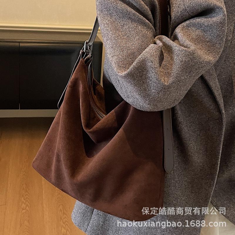 Замшевая сумка женская большой вместимости 2025 новая осенне-зимняя ретро сумка через плечо, сумка-мессенджер, сумка-тоут для通勤, сумка-ведро