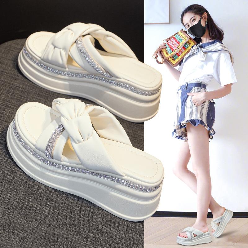 Крутые шлепанцы на толстой подошве со стразами женские летние 2025 маффин пляжные с утолщением с интернет-знаменитостями Универсальный рыбий рот