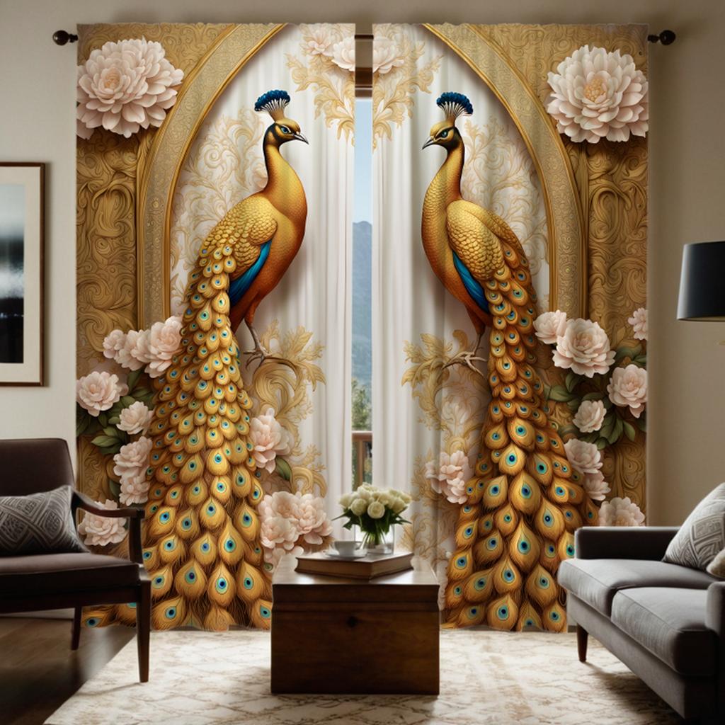Двухсекционная цифровая желтая занавеска HD с изображением цветка пиона и павлина, стиль украшения дома, украшение гостиной, спальни, штанга для одежды