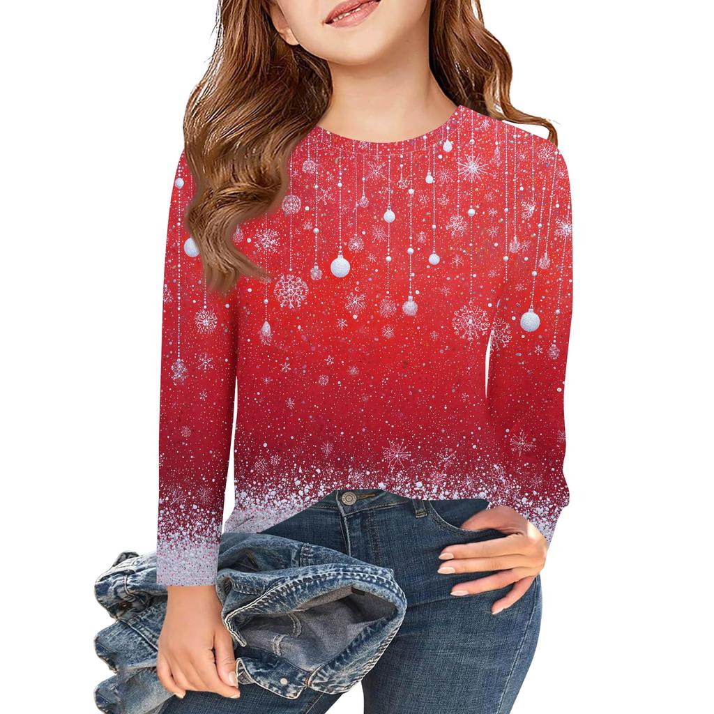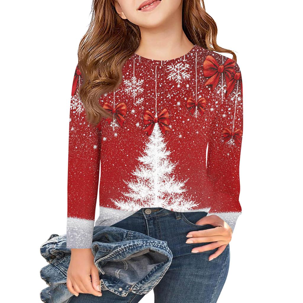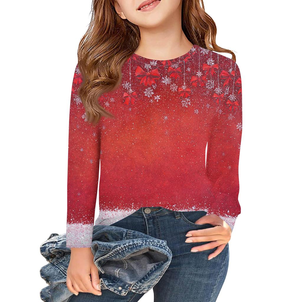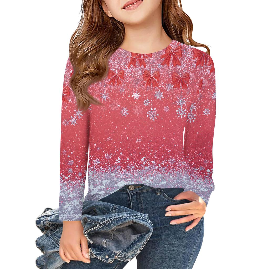 Рождественские футболки с длинным рукавом для девочек, детские осенние топы с круглым вырезом и принтом, базовые футболки