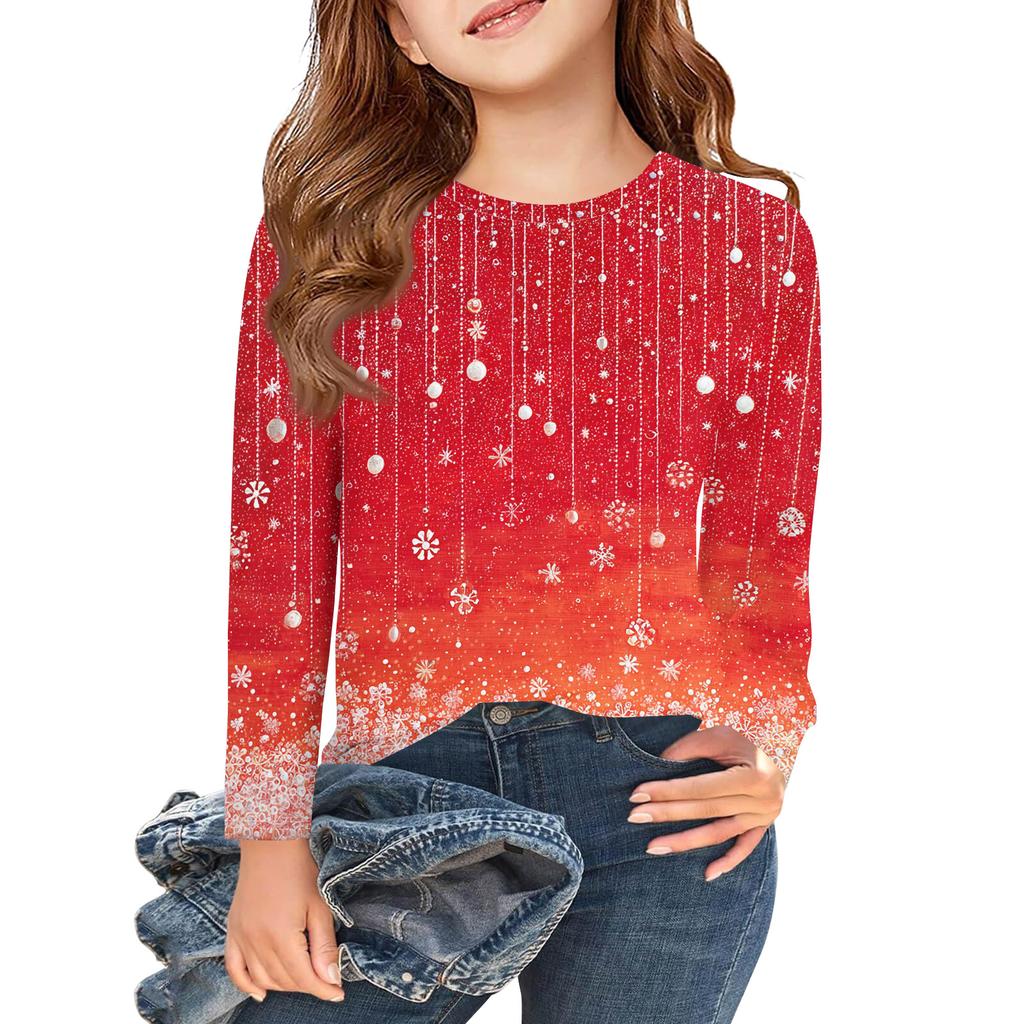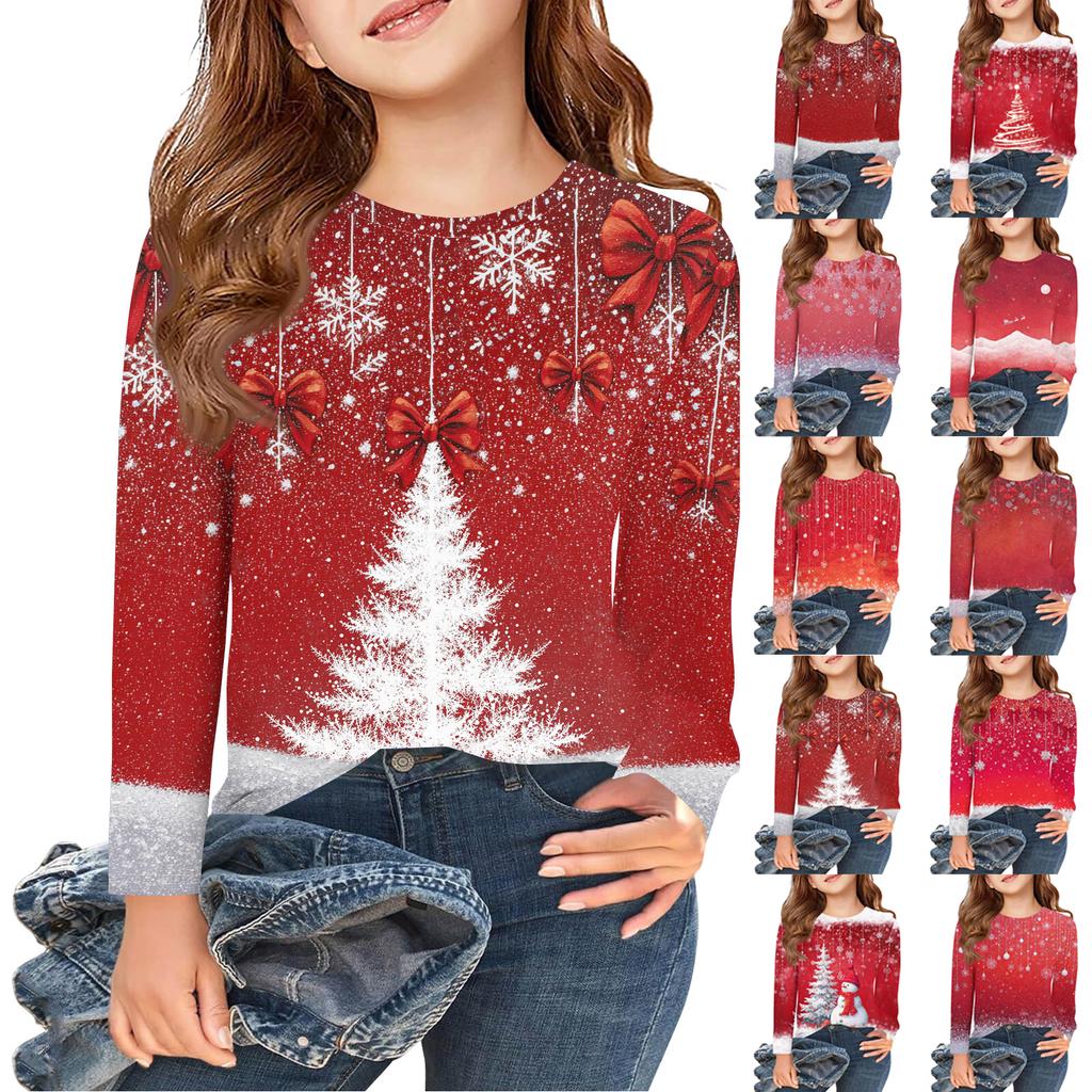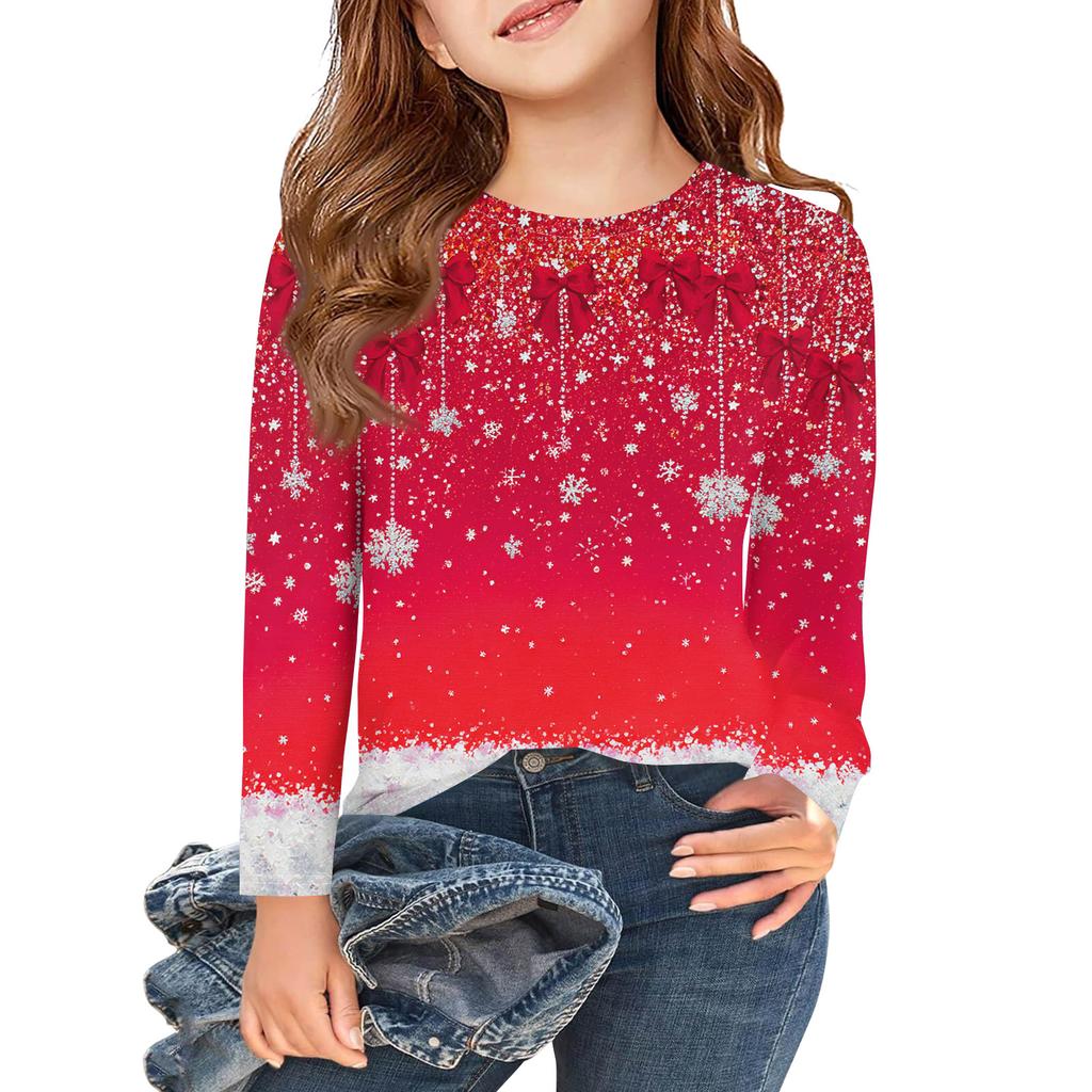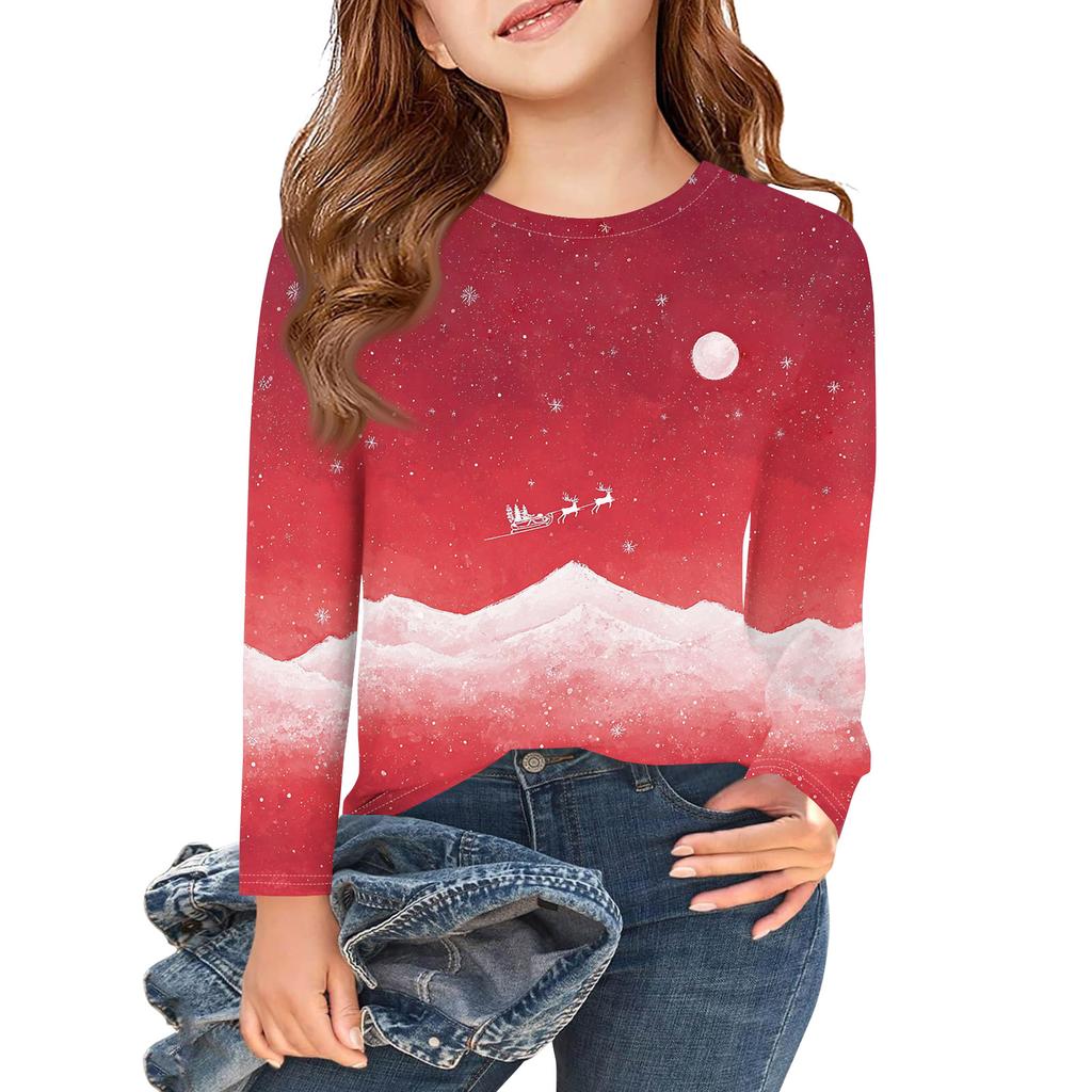 Рождественские футболки с длинным рукавом для девочек, детские осенние топы с круглым вырезом и принтом, базовые футболки