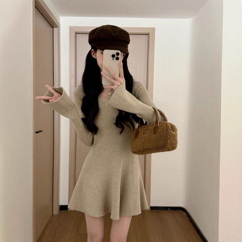 Осень Зима V-образный вырез Элегантная Мода Вязаное Мини-платье Женщины Длинный рукав Все-в-одном Нижнее платье Халат Vestidos