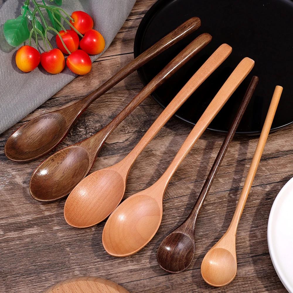1/10 шт. Длинная ручка Деревянная ложка Деревянный половник для супа Кухонные ложки для перемешивания Десерт Мед Кофе Перемешивание Чайные ложки Набор посуды