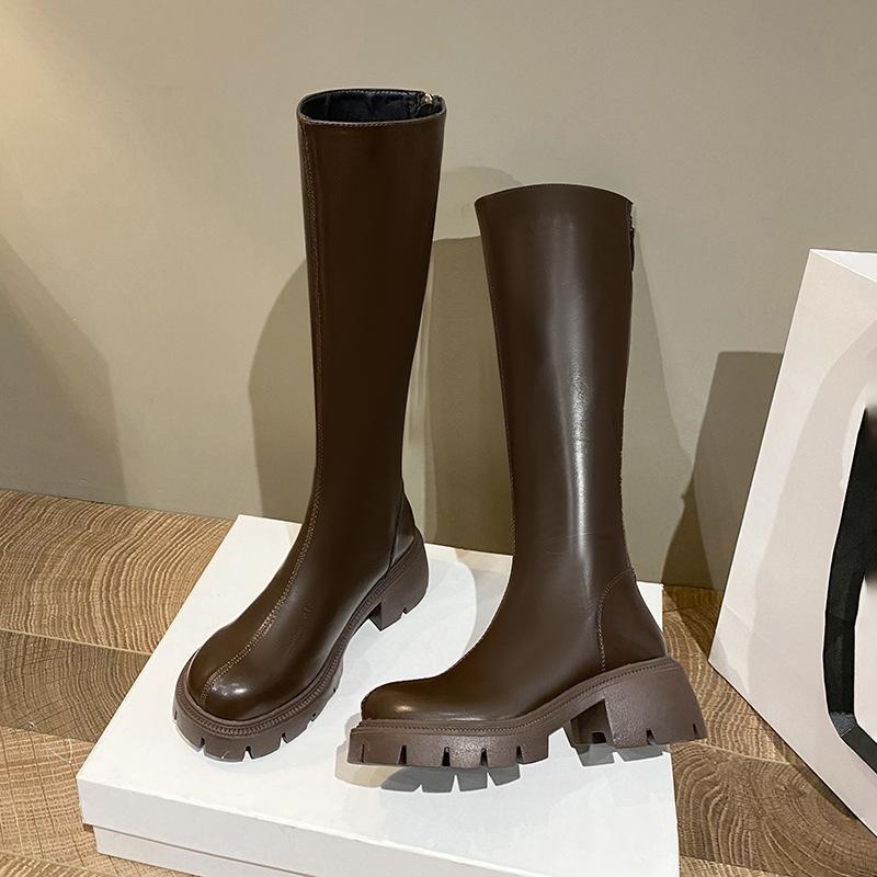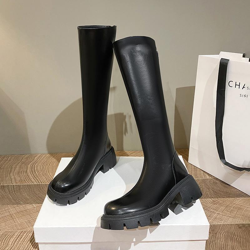Ботинки на толстой подошве с плоским голенищем 2025 новые высокие ботинки на толстом каблуке, но для полных коленей, мм расширенные, с задней молнией, рыцарские ботинки