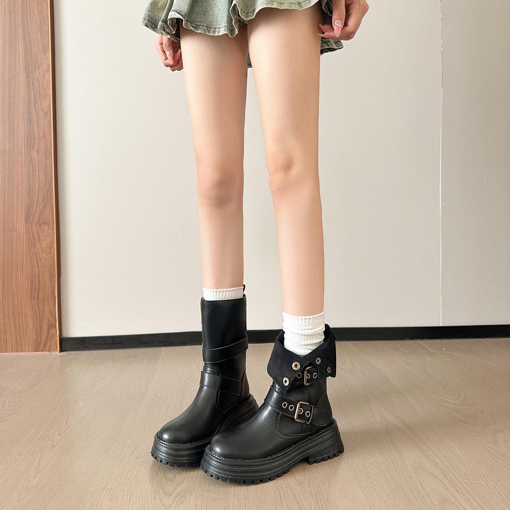 Осень 2025 увеличение высоты на 8 см ретро складки два способа носки толстая подошва ботинки Мартин женские новые круглый носок пряжка на ремне полусапоги