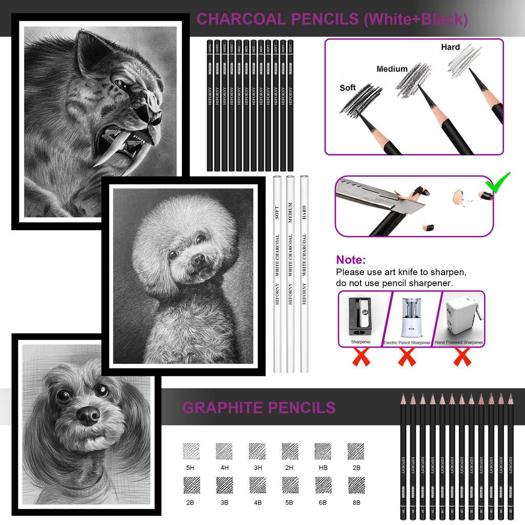 【Полный набор инструментов для рисования】Набор для рисования HIFORNY из 136 предметов включает 9 профессиональных карандашей для рисования, позволяющих экспериментировать с различными стилями рисования. В этот набор входят 12 угольных карандашей, 12 графитовых карандашей, 24 цветных карандаша Black Edition, 24 акварельных цветных карандаша, 12 цветных карандашей с металлическим эффектом, 3 белых угольных карандаша, 2 цельнографитовых карандаша, 1 бесцветный карандаш-блендер и 1 карандаш-ластик с кистью. Каждый карандаш промаркирован своим названием и моделью и идеально подходит для рисования, эскизов, раскрашивания, наложения слоев, растушевки и многого другого.