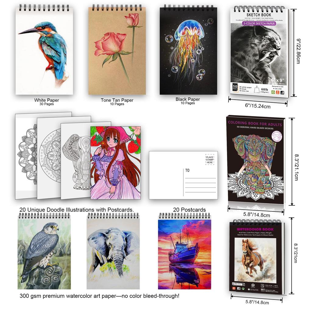 Уникальный 3-цветный скетчбук, раскраска и акварельный альбом: 6 x 9 дюймов, 100 г/м², 50 страниц (30 белых, 10 тонированных, 10 черных) - Бумага для эскизов разных цветов подходит для различных стилей рисования. Книжка-раскраска формата А5, 160 г/м², 20 уникальных иллюстраций-дудлов. Бумага премиум-класса подходит для различных инструментов для раскрашивания. Каждую иллюстрацию также можно использовать как открытку, которую можно отправить куда угодно с маркой.. Альбом для акварели формата А5, 300 г/м2, 12 страниц. Хорошо впитывает воду, отлично смешивается и оставляет чистые линии без смазывания.. Бескислотные, устойчивые к выцветанию листы можно использовать как для сухих, так и для мокрых техник.