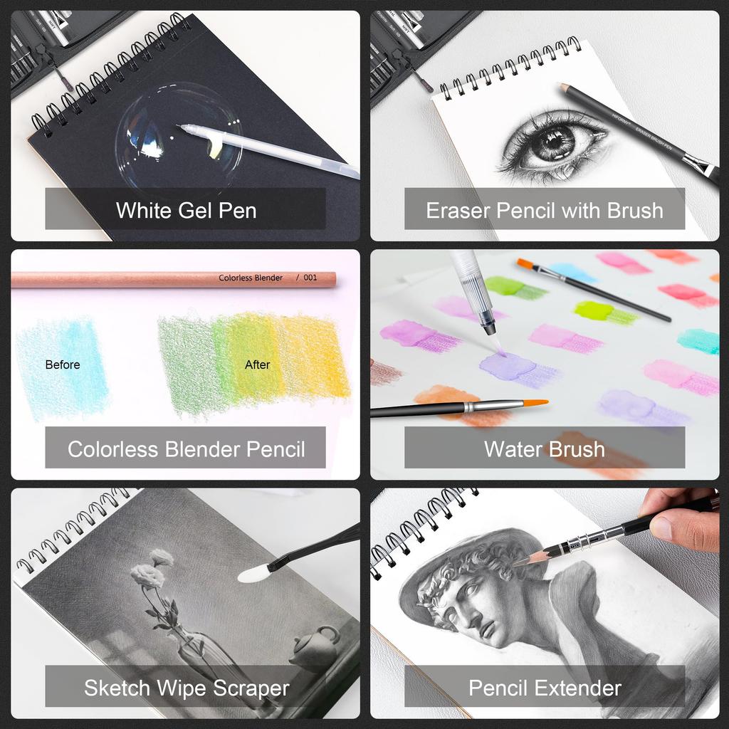 【Набор дополнительных принадлежностей для рисования и эскизов】Этот набор для рисования включает почти все аксессуары, необходимые для рисования и эскизов, в том числе 3 графитовых стержня, 3 угольных стержня, 3 растушевки, 2 скребка для стирания эскизов, 20 сменных головок, 1 клячку и 1 виниловый ластик, 1 белую гелевую ручку, 1 кисть для воды, 2 кисти, 1 наждачный блок, 2 точилки, 1 художественный нож и 1 удлинитель для карандашей. Эти дополнительные предметы необходимы как художникам, так и начинающим.
