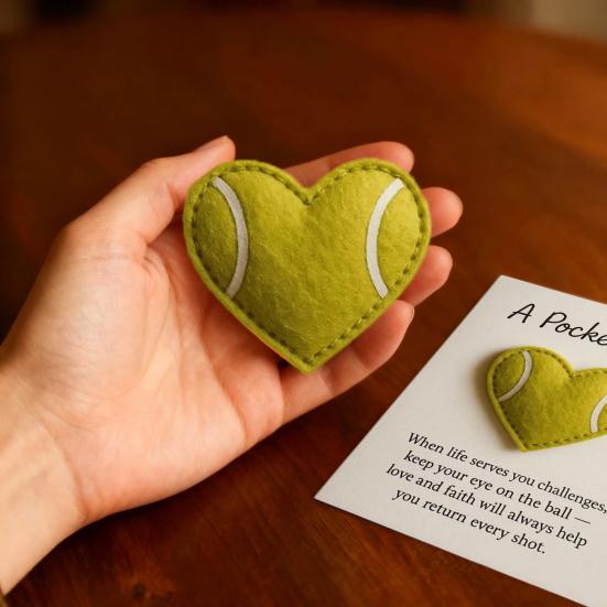 Представляем «Карманное объятие», уникальный дизайн, сочетающий дух спорта с любовью и заботой.. Украшение в форме сердца искусно имитирует узор теннисного мяча, символизируя как атлетизм, так и привязанность.. Носите тепло и компанию с собой, куда бы вы ни пошли, с этим трогательным карманным объятием..