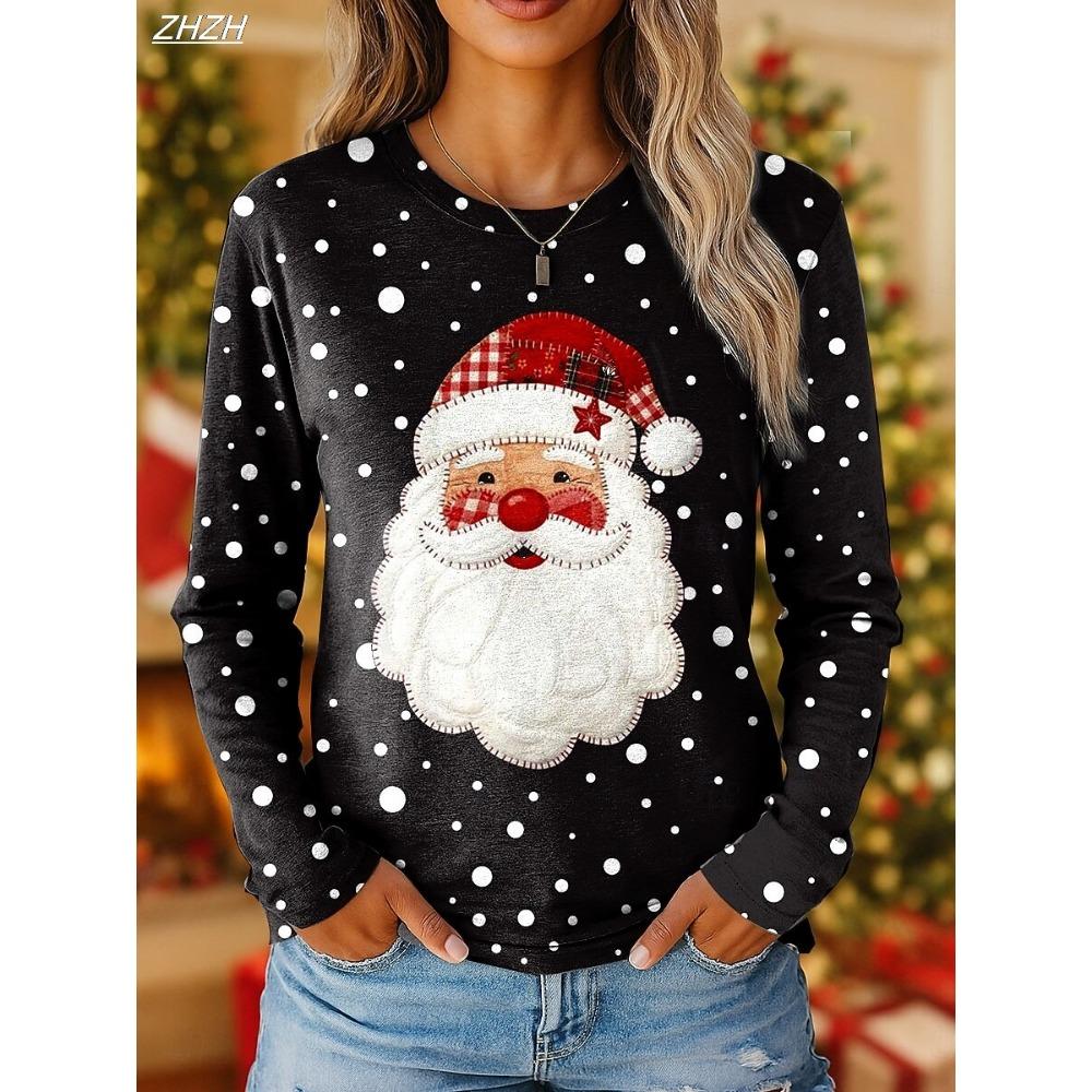 Женский классический топ с длинным рукавом и праздничным принтом Санты, с круглым вырезом, в повседневном стиле для праздников, сезонная модная футболка для осени и зимы