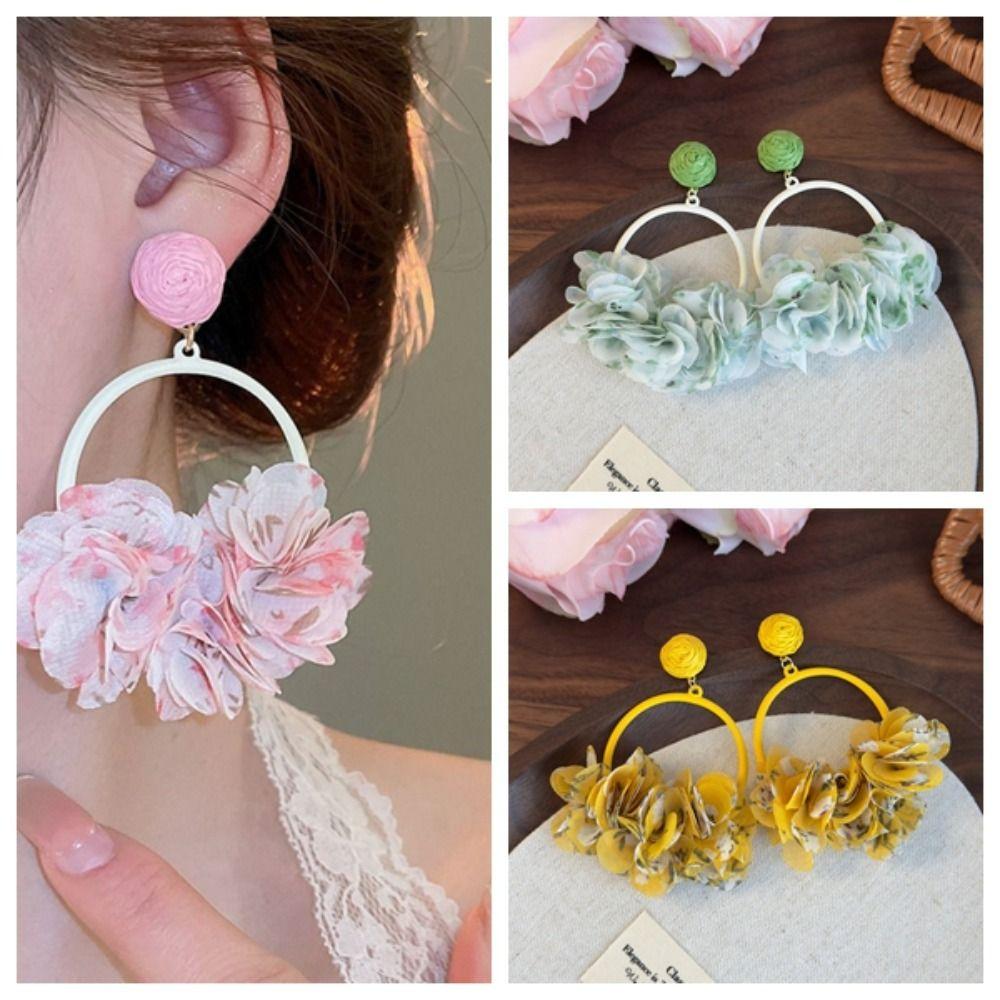 Sweet Fabric Flower Eardrop Round Hollow Exaggerated Earrings Elegant Drop Earrings Women