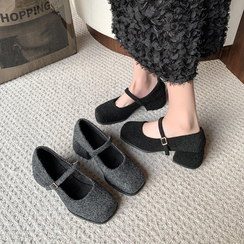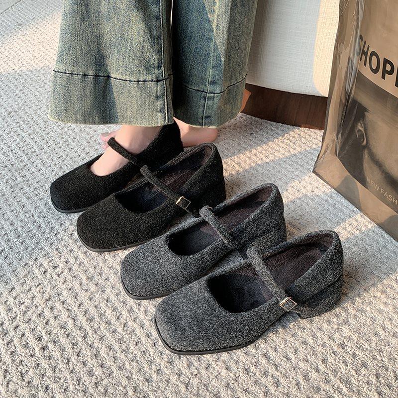 Повседневные толстые каблуки высокие каблуки французские шерстяные туфли 2025 Мэри Джейн одинарные туфли квадратный носок серый пух маленькие ароматные женские новые модели