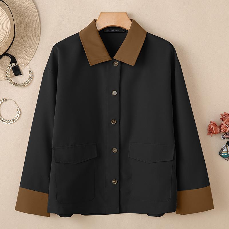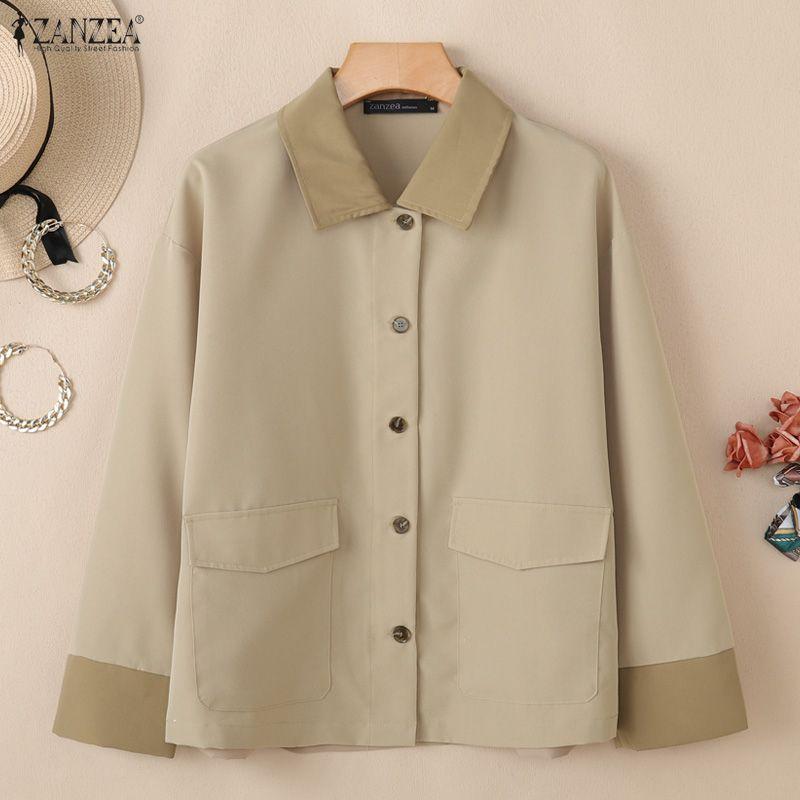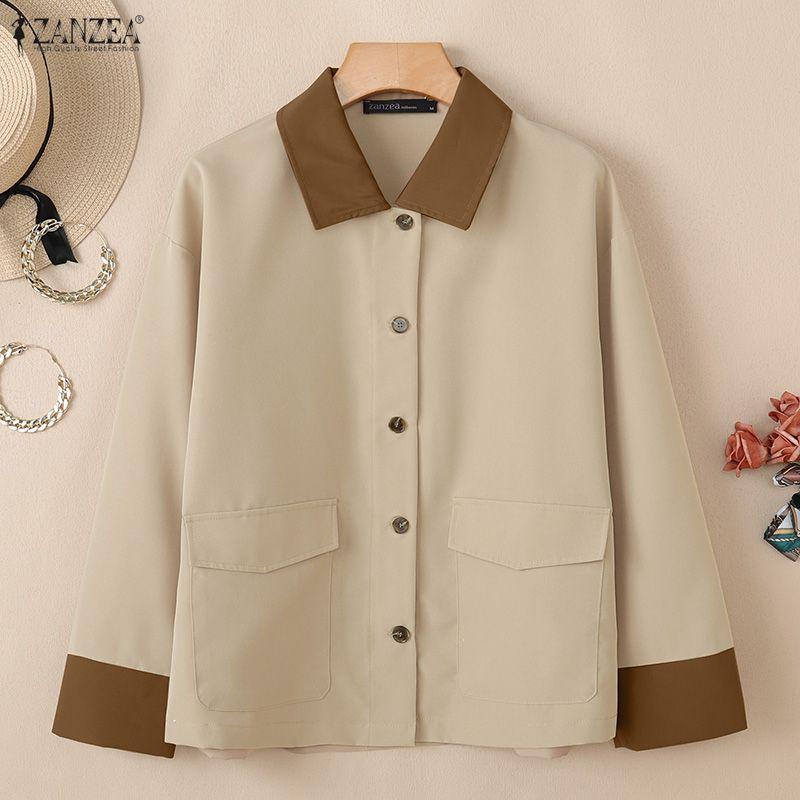 ZANZEA Женская повседневная блузка с контрастным воротником, свободного кроя, с длинным рукавом
