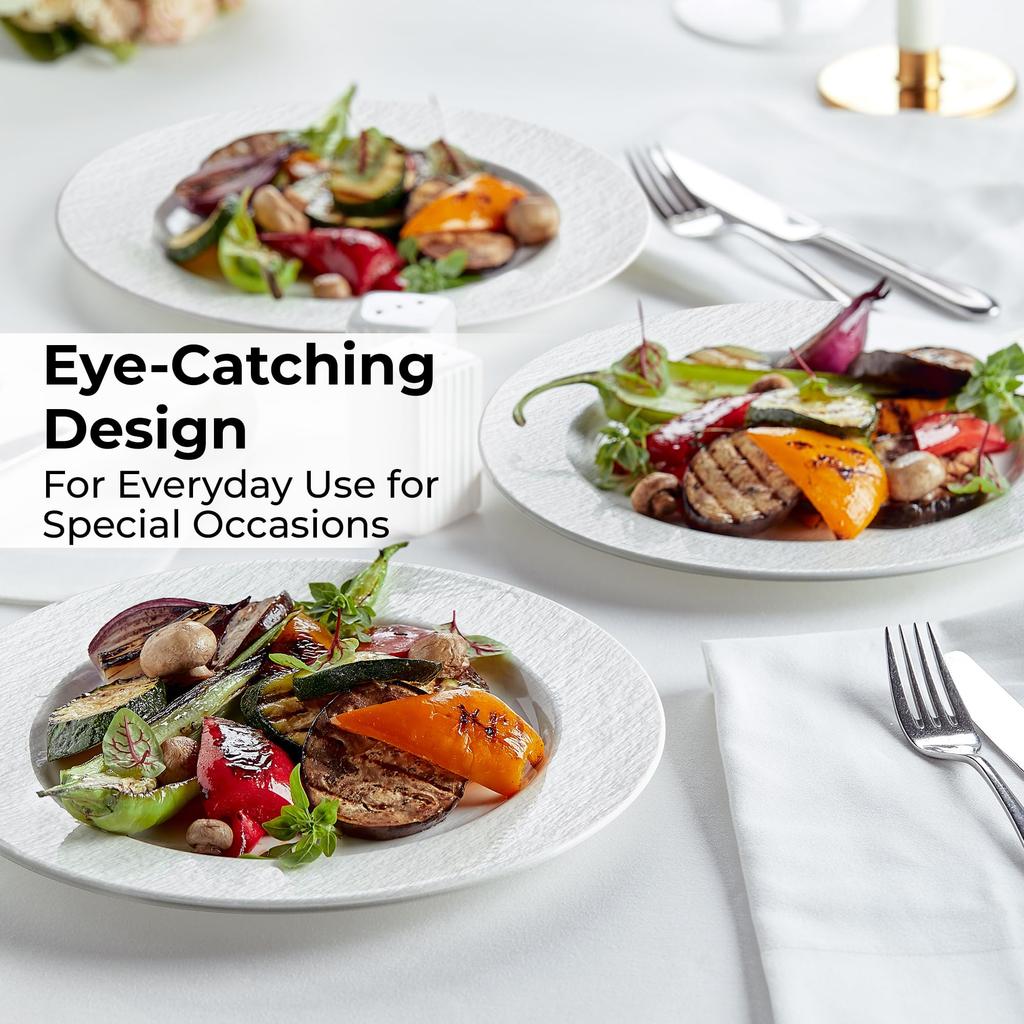 VERSATILE USE - This 4-piece ceramic plate set's elegant design makes it ideal for serving a variety of dishes. It can also be used as a pasta plate, cake plate, dessert plate, or pizza plate. The ergonomic design of the kitchen plate set/ceramic dinnerware set makes them easy to handle and stack neatly.