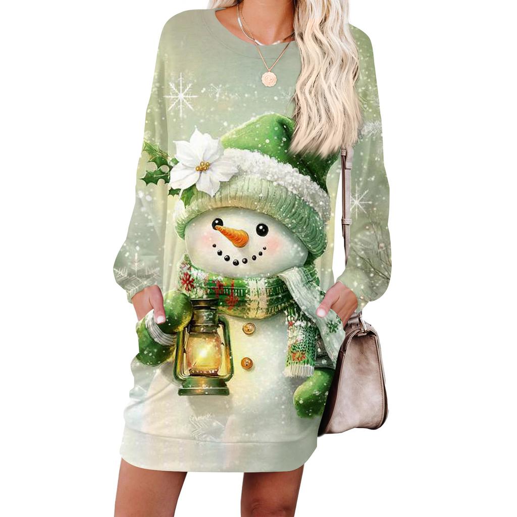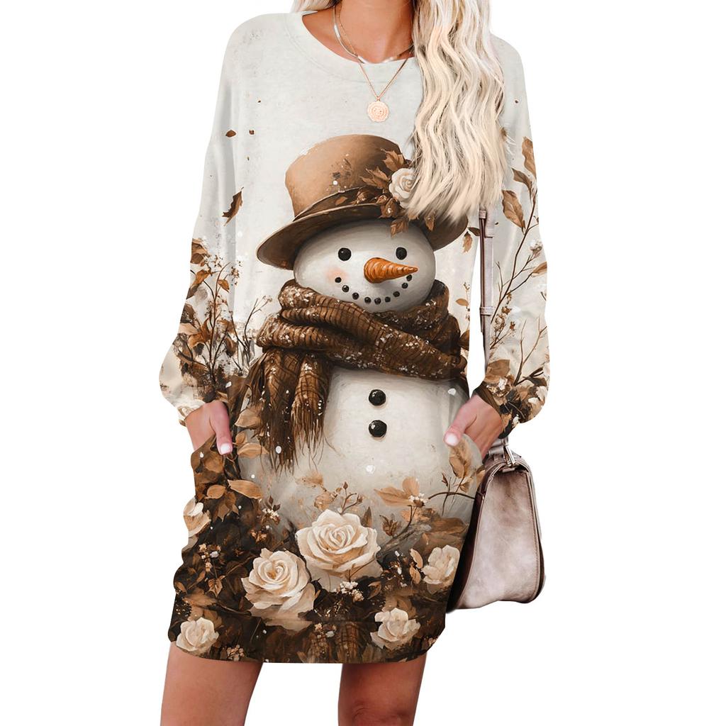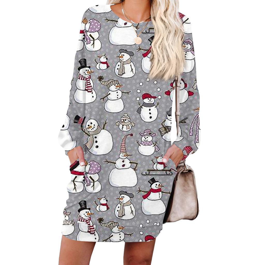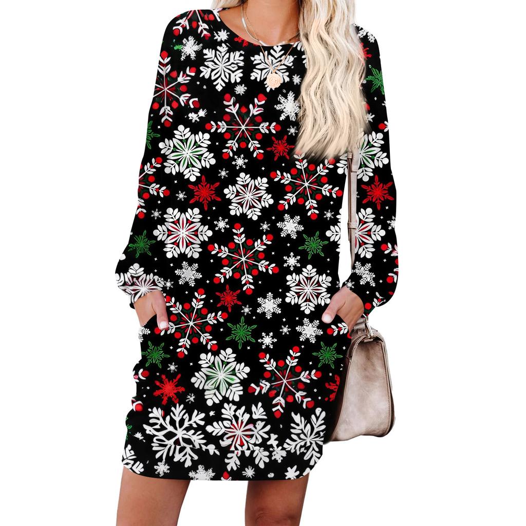 Женское модное платье с длинными рукавами, круглым вырезом и карманом с принтом «снежинки»