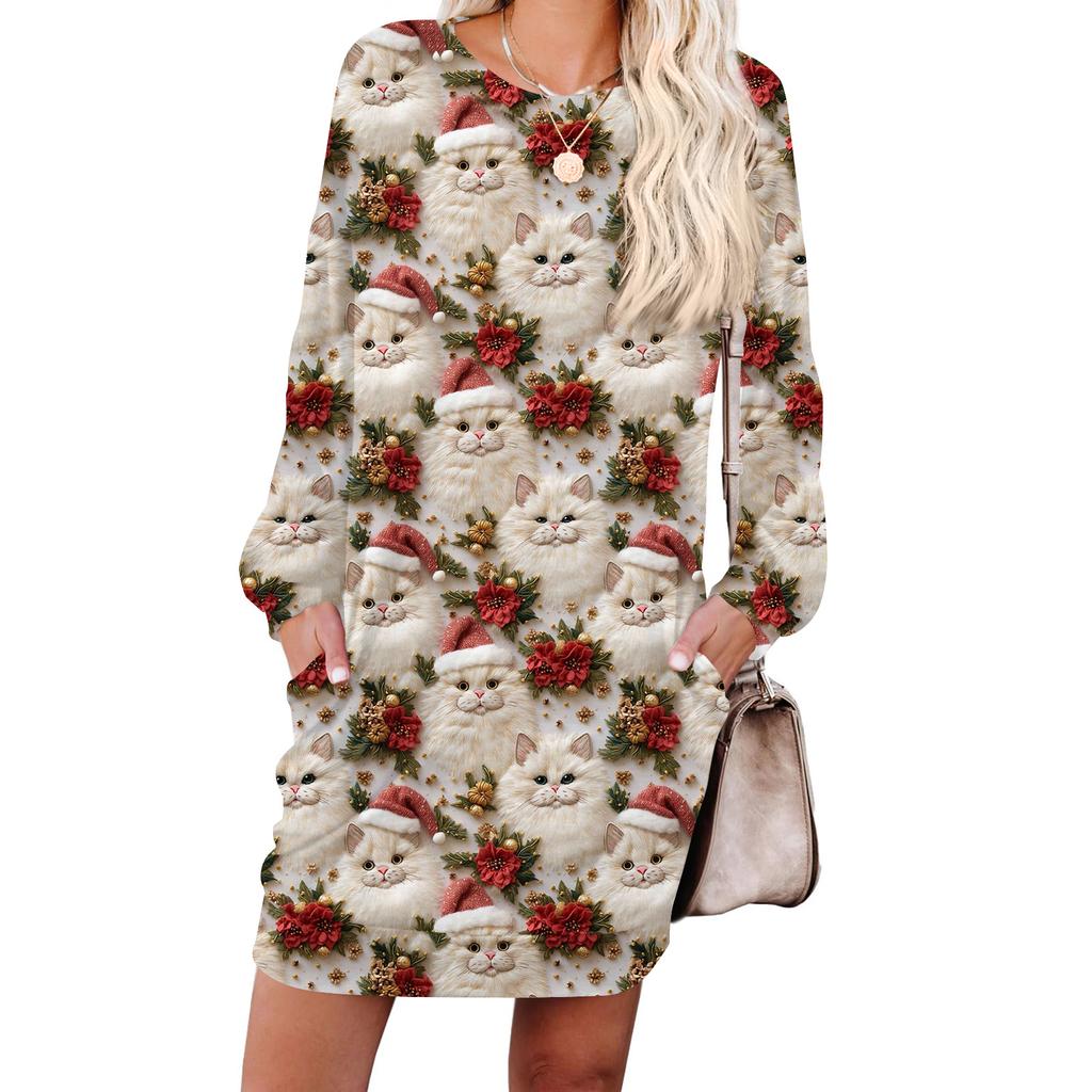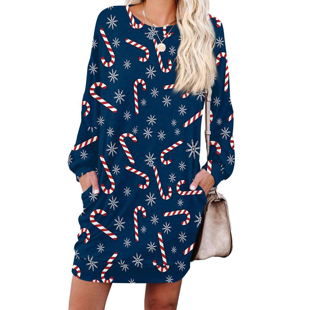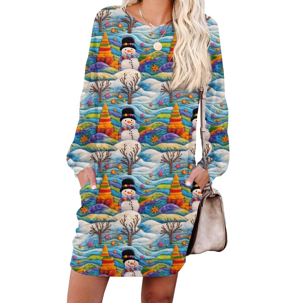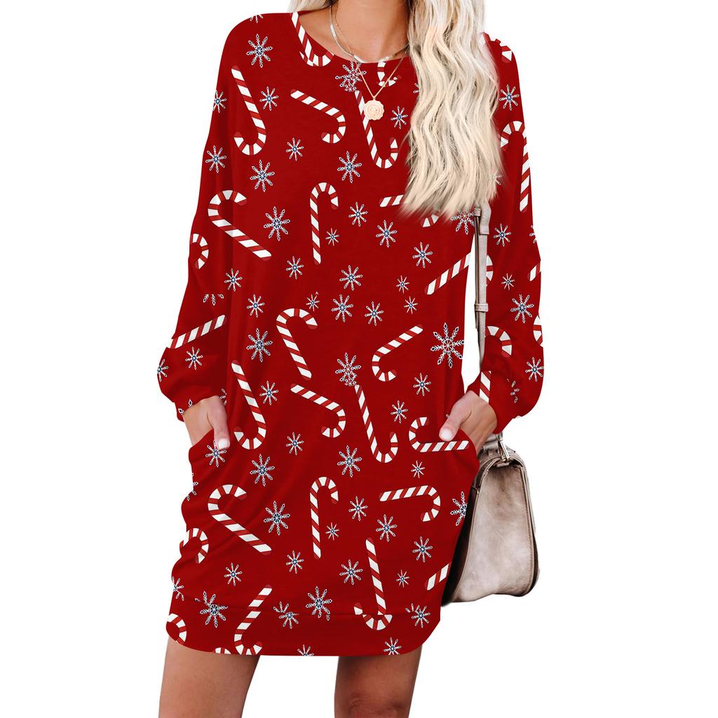 Женское модное платье с длинными рукавами, круглым вырезом и карманом с принтом «снежинки»