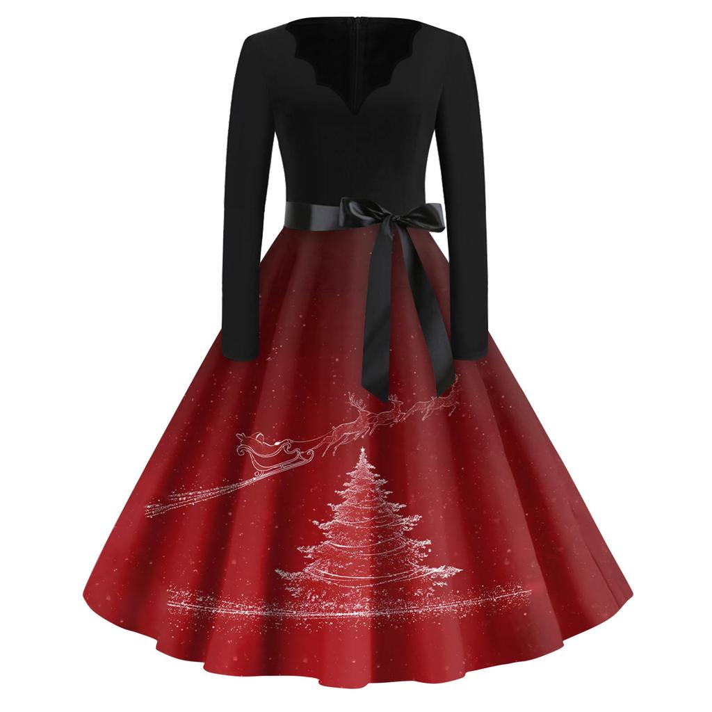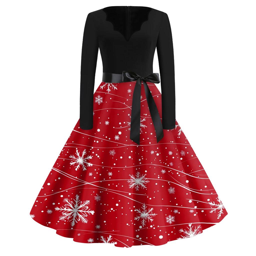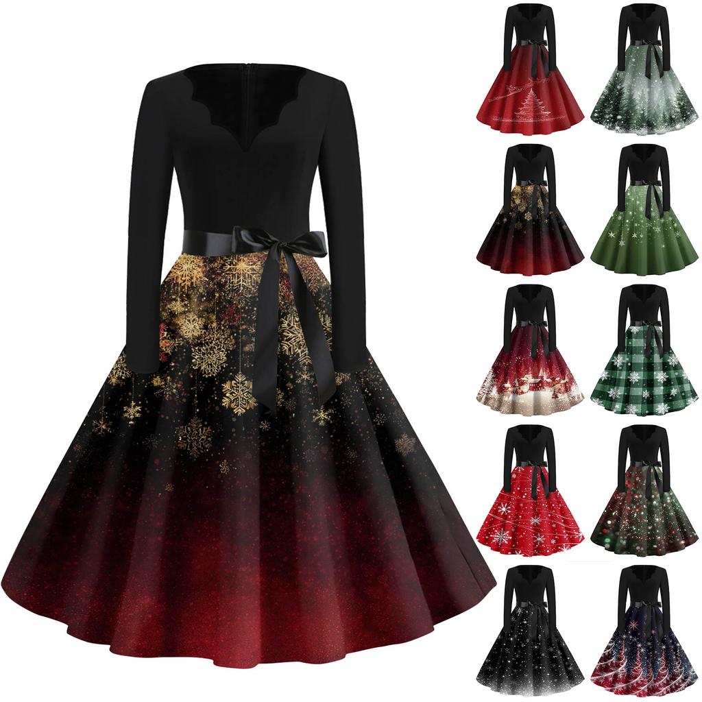 Женское модное платье с V-образным вырезом, свободного кроя, с рождественским принтом и длинными рукавами