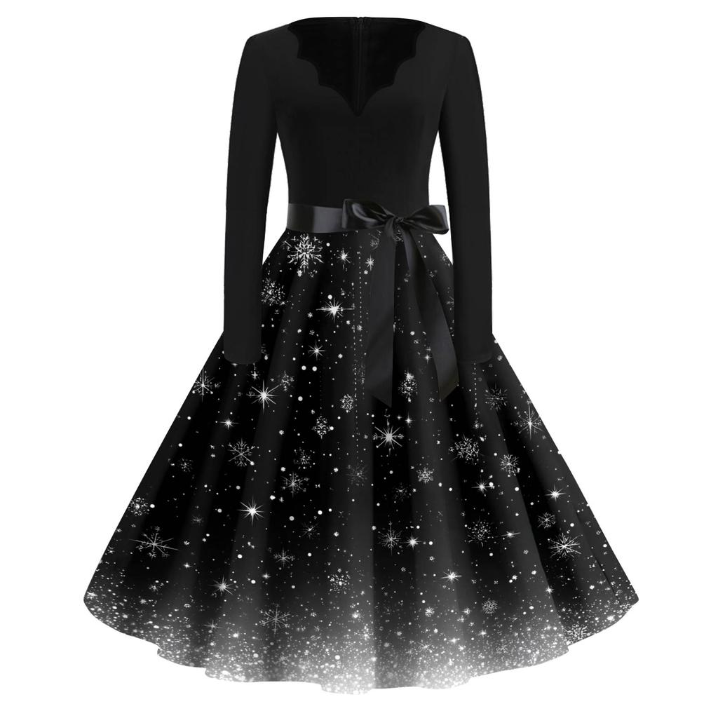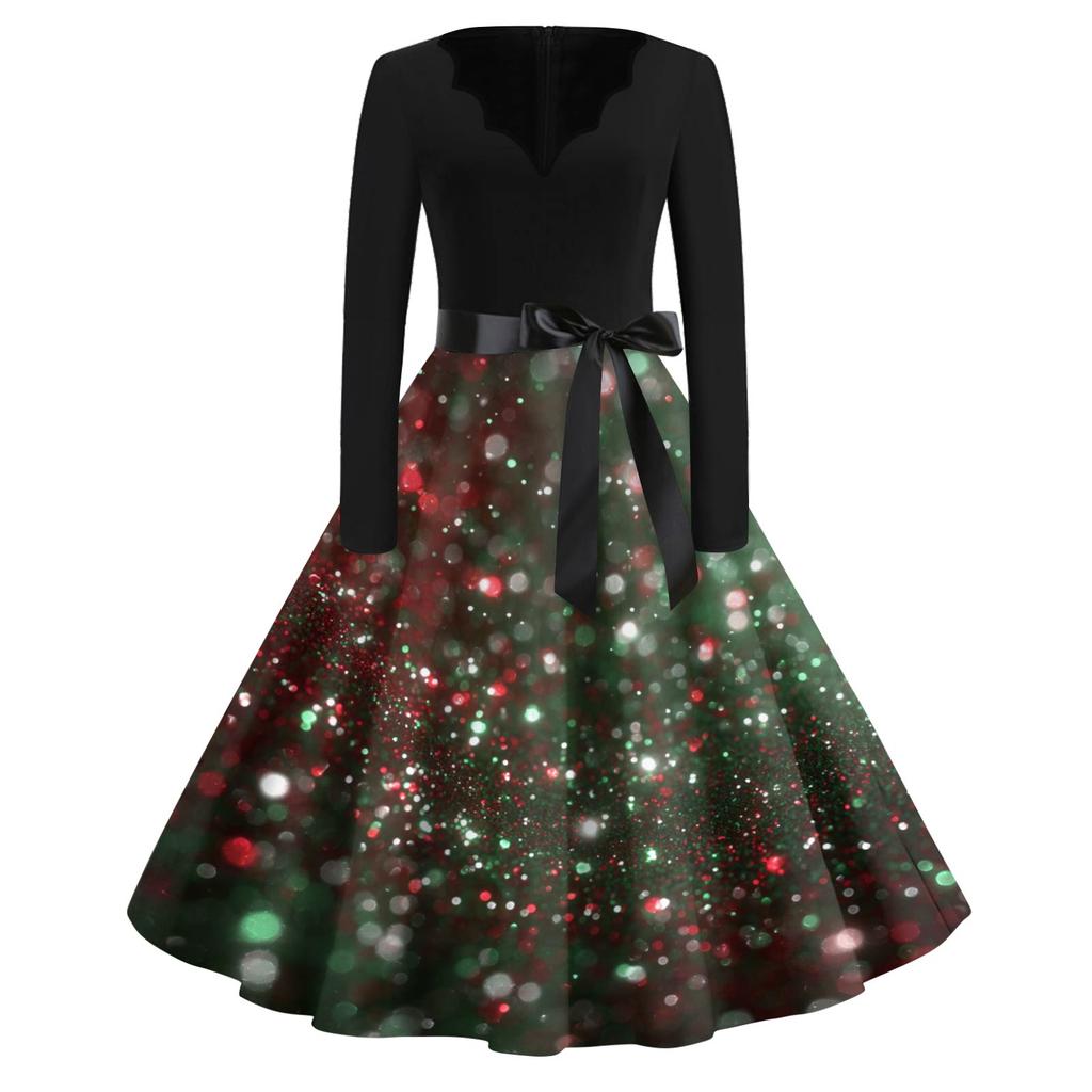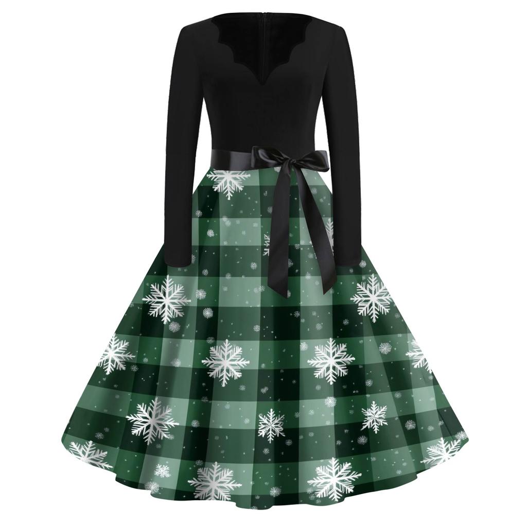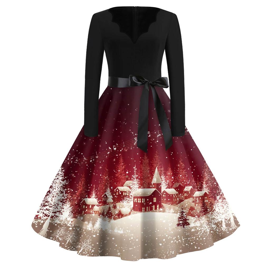 Женское модное платье с V-образным вырезом, свободного кроя, с рождественским принтом и длинными рукавами
