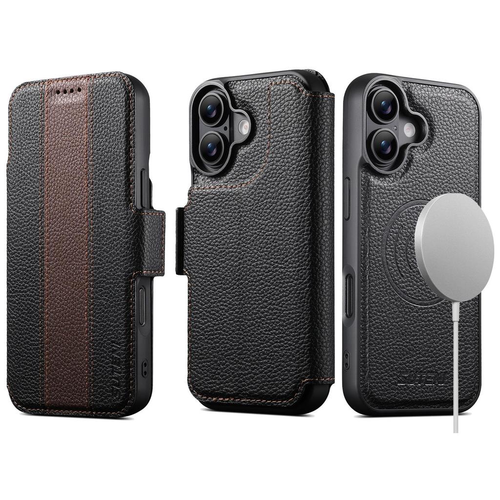 Чехол-книжка для iPhone 17: Слот для карт, Магнитная застежка, Подставка для беспроводной зарядки, Кошелек с цветными блоками, Кожа